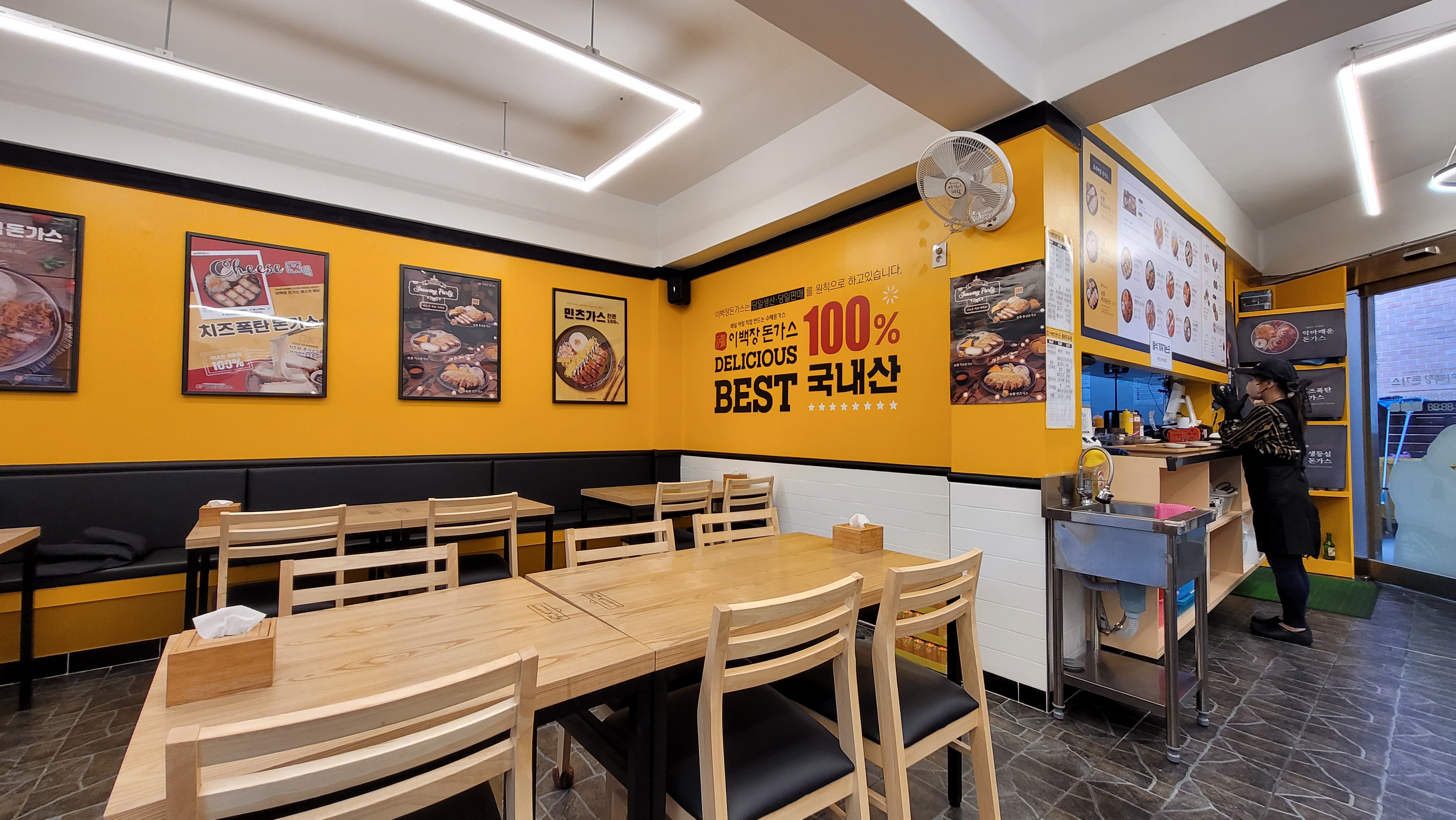 이백장 돈가스 식당 내부 모습입니다. 주방 쪽 벽면에 메뉴판과 음식 이미지가 커다랗게 붙어 있습니다. 메뉴에 이미지가 곁들어 있어 시인성이 좋은 것 같습니다. 돈가스가 다양한 형태의 메뉴로 선보이고 있더라고요. 반반 돈가스나 로제 돈가스 등 등. 프랜차이즈라 이렇게 다양한 메뉴를 선 보일 수 있는 것 아닐까요?