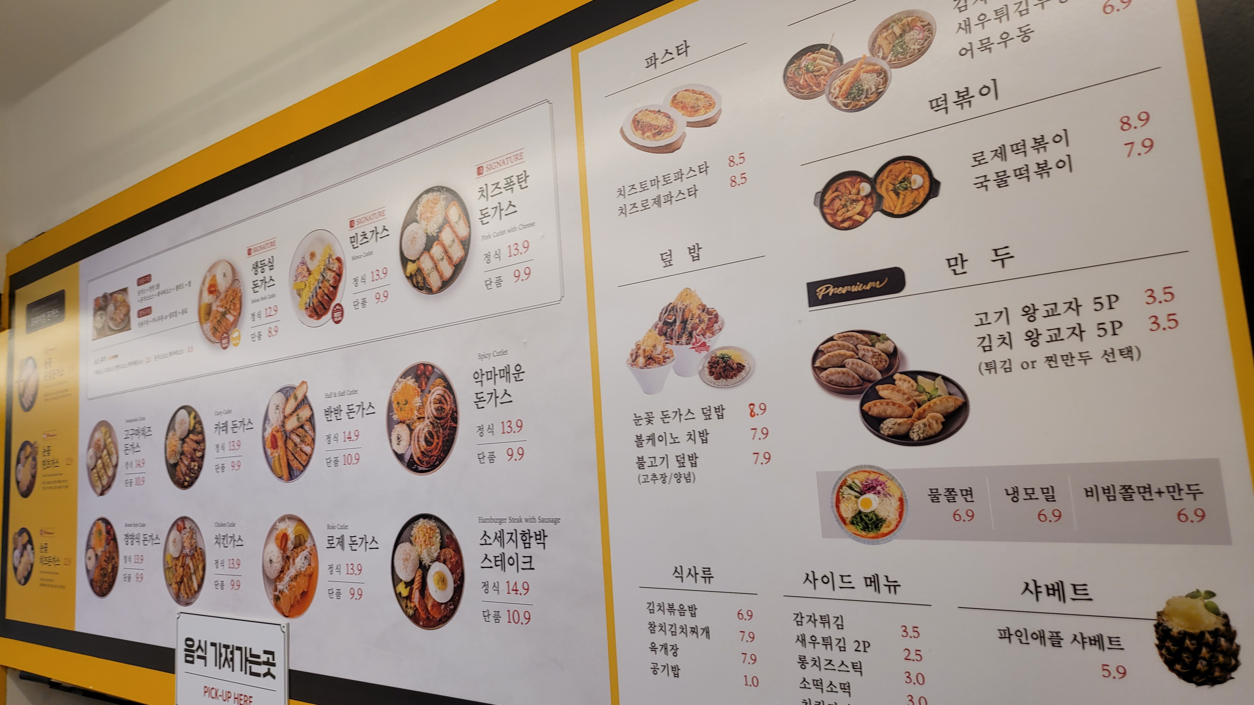 돈가스 전문 프렌차이즈인데 만두, 파스타, 김치볶음밥 같은 식사 외 감자튀김이나 새우튀김 같은 사이드 메뉴, 그리고 파인애플 샤베트까지 정말 다양하게 선보이고 있습니다. 어찌 보면 바로 근처에 있는 길동우동과 비슷한 푸드코트형 식당 컨셉 같습니다. 그러고 보면 주변에 떡볶이 파는 곳이 잘 안 보이는데 여기서 먹으면 되겠네요. 왠지 국물떡볶이가 맛있을 것 같은... 악마 매운 돈가스는 얼마나 맵길래 저렇게 이름을 지었을까요?😅 저는 오늘 치즈 폭탄 돈가스 단품을 먹었는데, 정식은 또 어떻게 나올지 궁금한데요. 그런데 가격은 살짝 부담이 되네요^^;;;