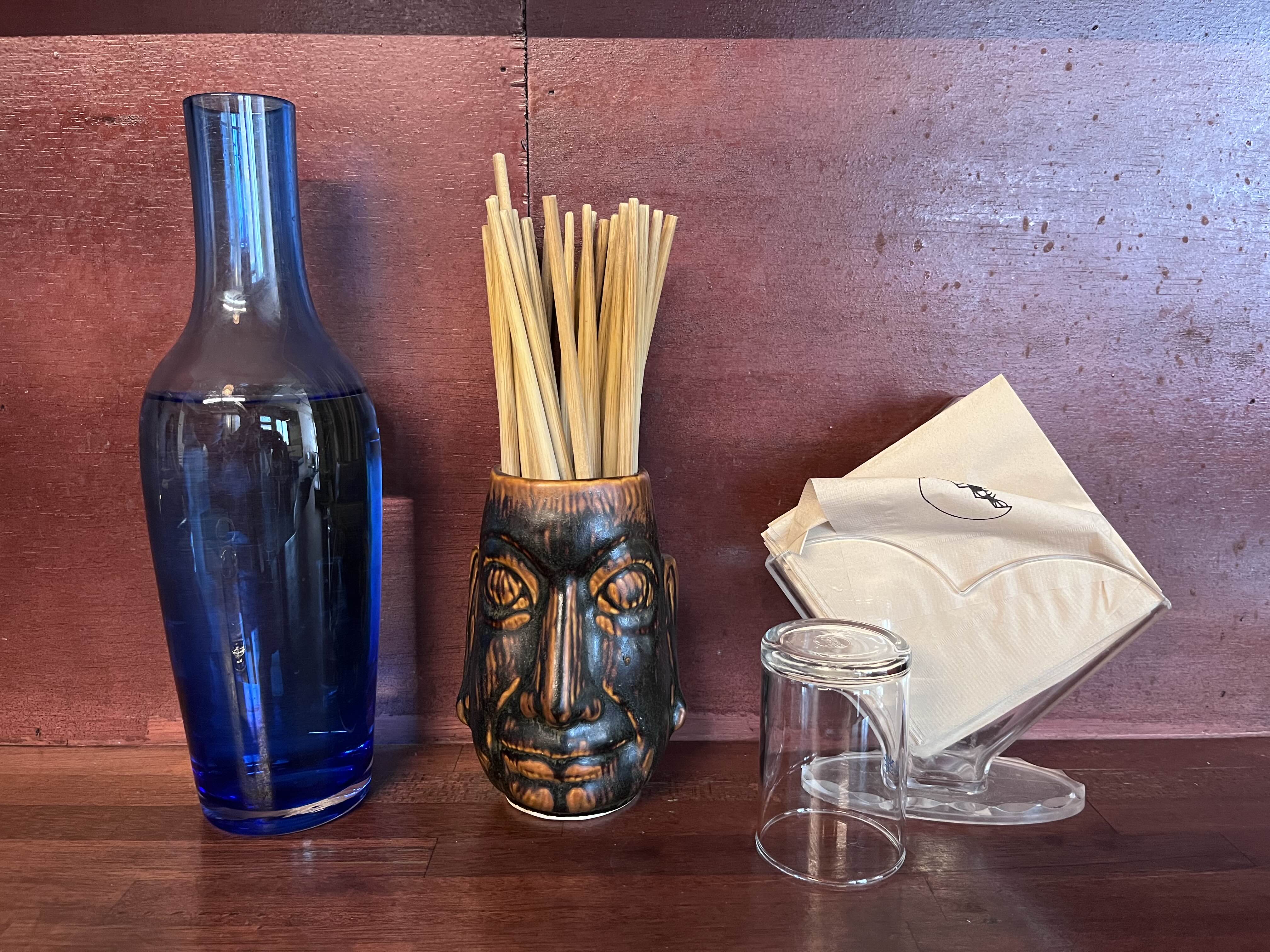 인디언 느낌의 젓가락통과 파란 물병... 굉장히 이색적이었습니다.