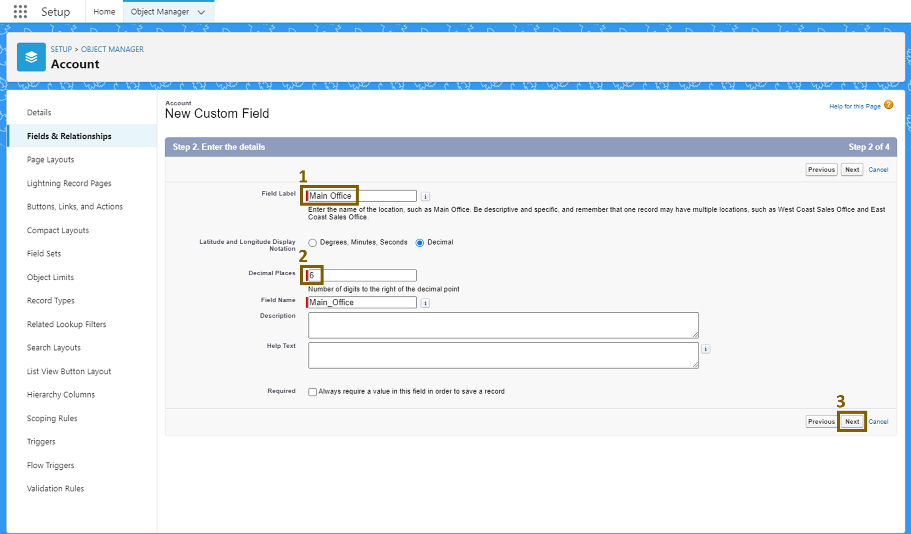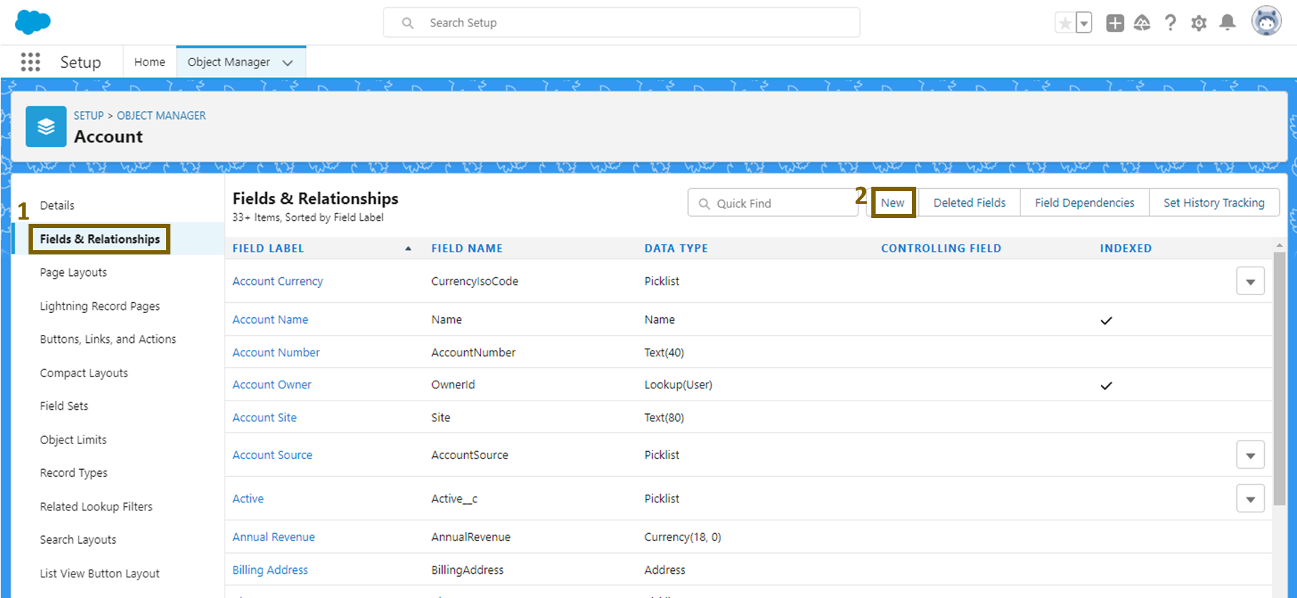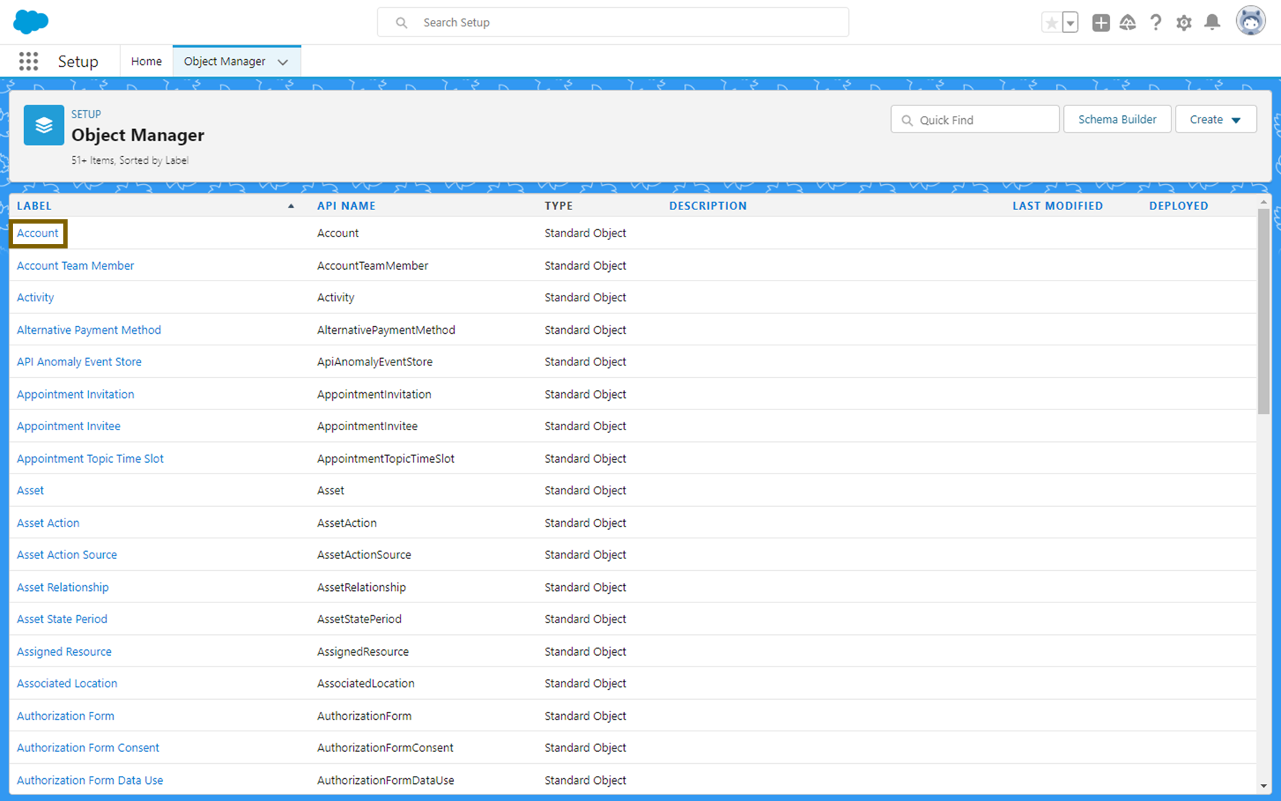 먼저 오브젝트 매니저에서 'Account'를 클릭합니다.