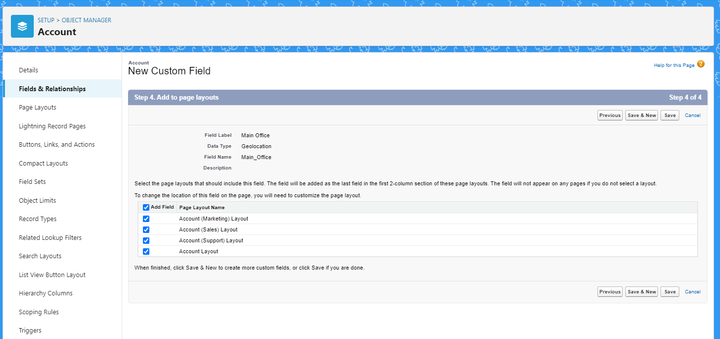 이상 'Account'에 'Geolocation'을 구현해 보았으며, 다른 객체에도 적용시킬 수 있다는 것을 참고하면 좋을 것 같습니다.