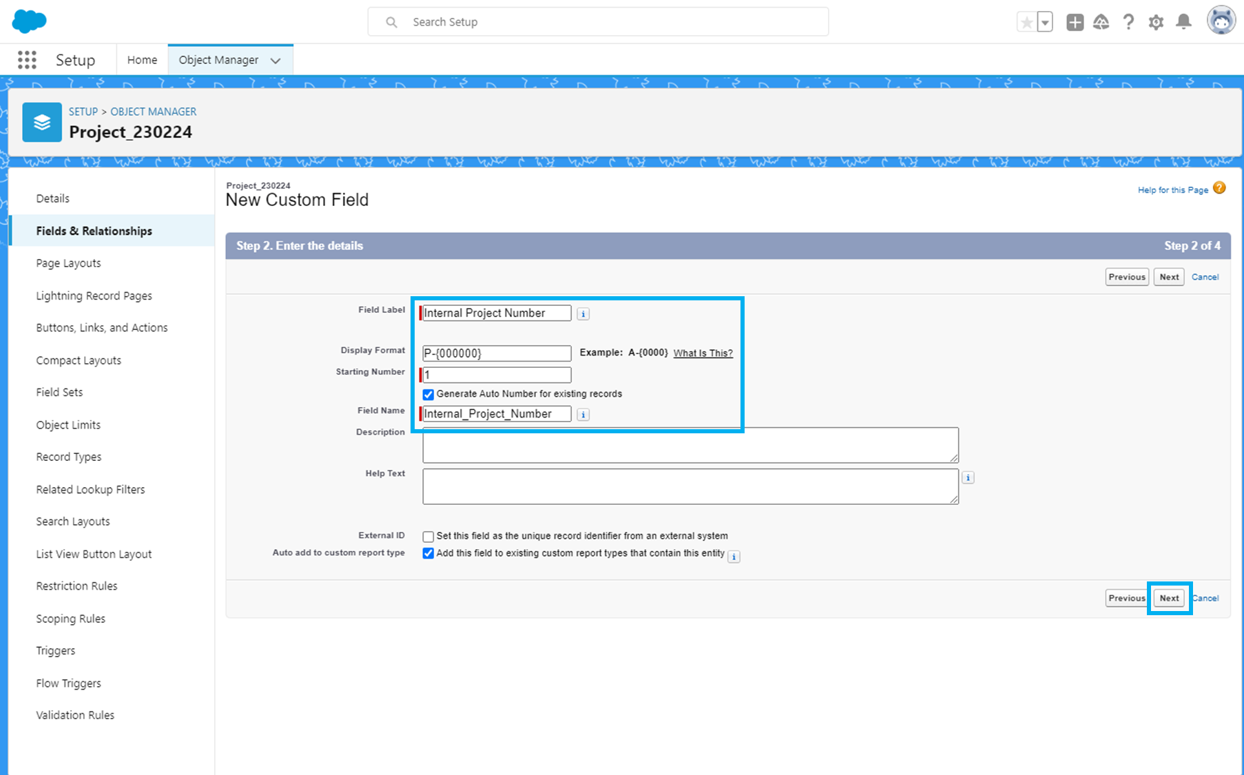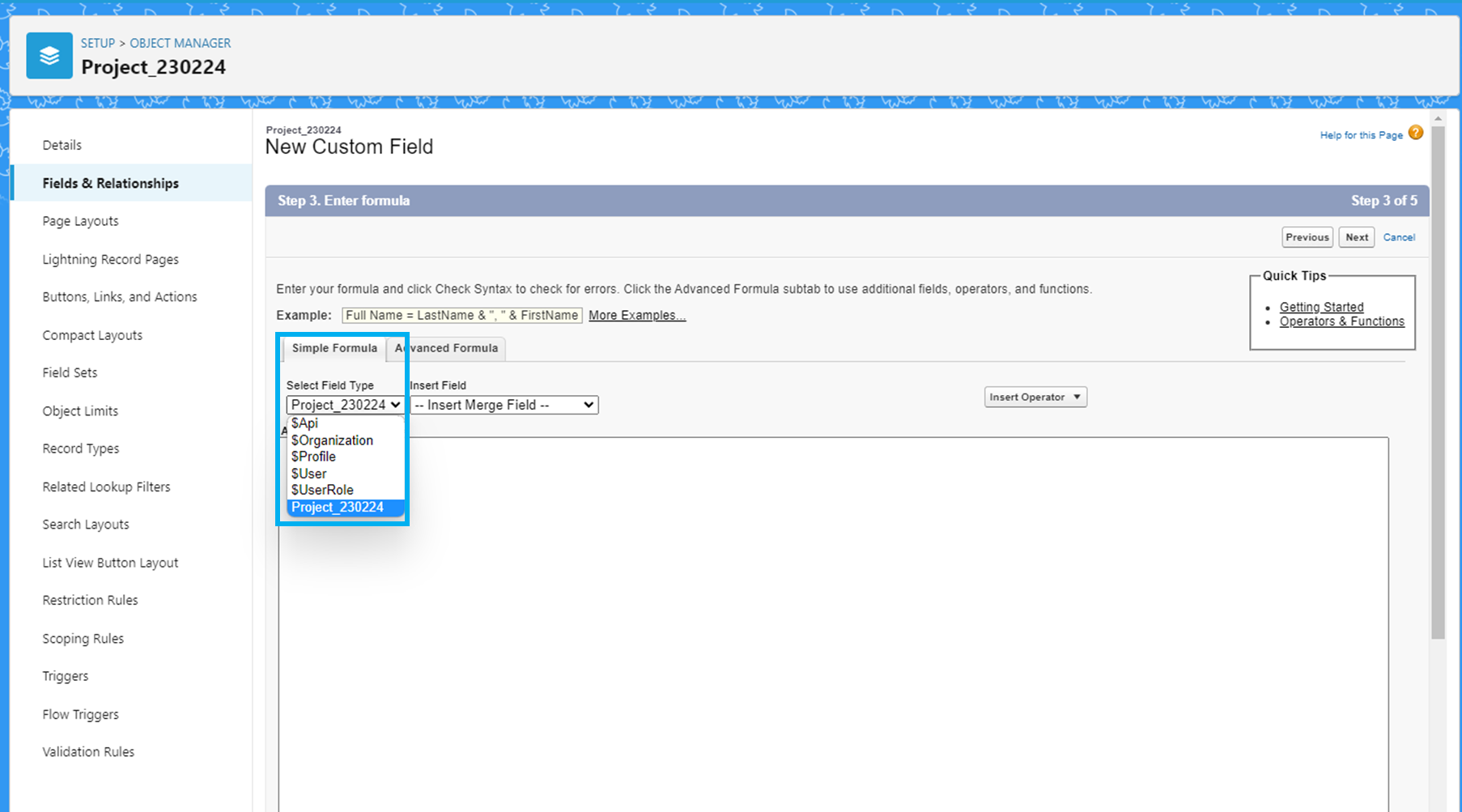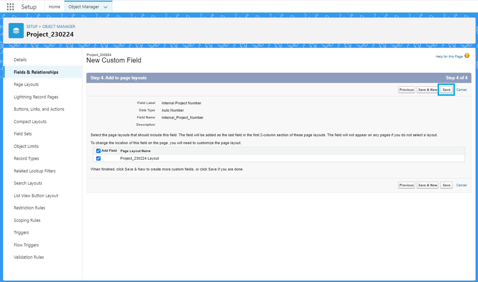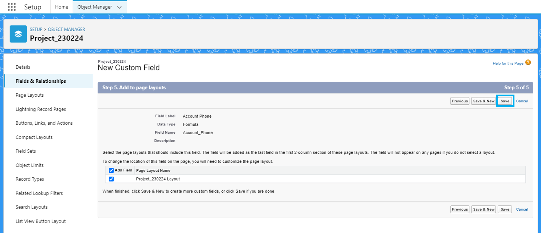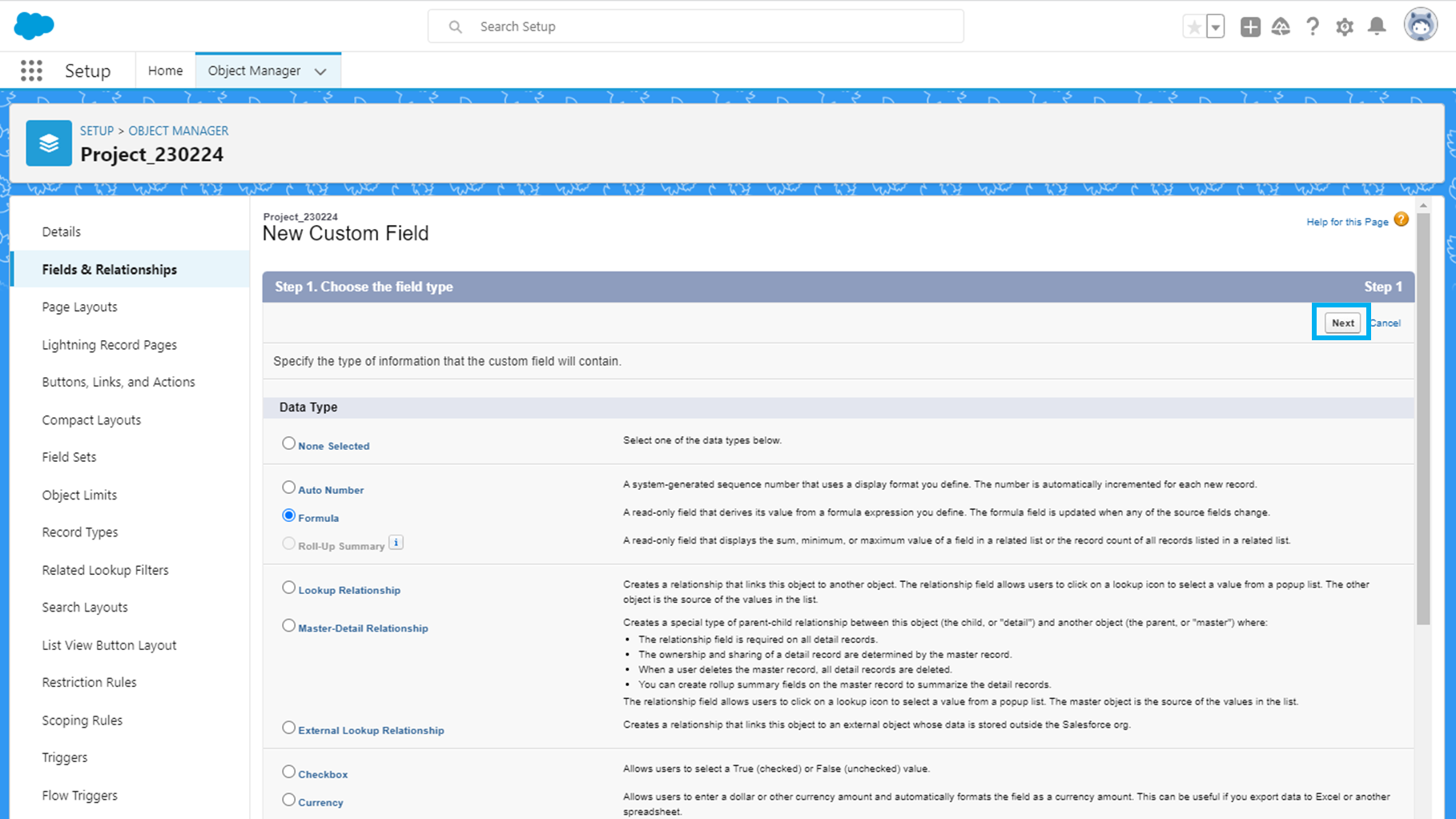 프로젝트 객체의 Object Manager - Fields & Relationship에서 'New'를 클릭합니다.