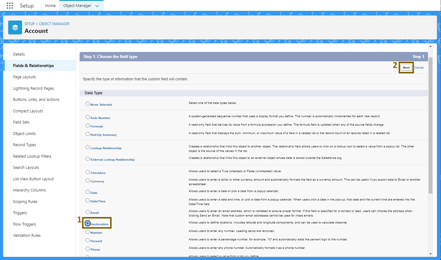 어카운트의 위치를 나타내는 Geolocation 필드 생성.