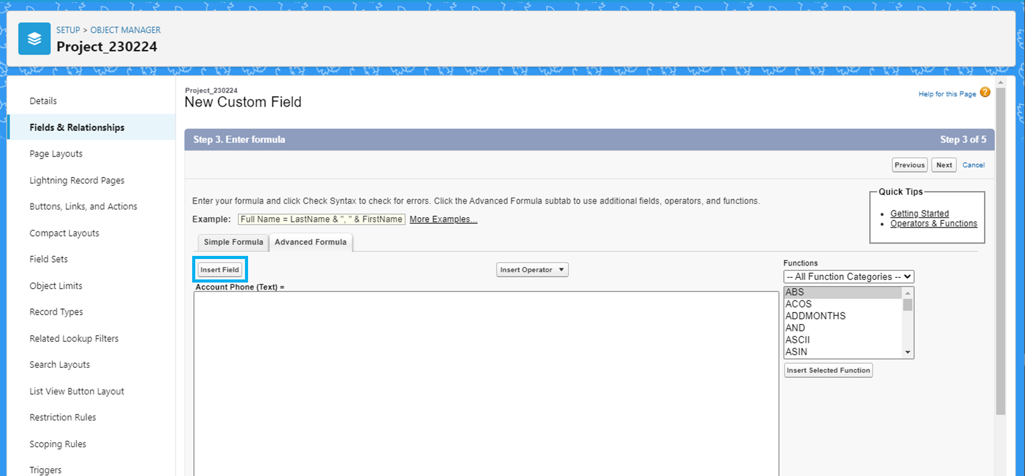 'Insert Field'를 클릭합니다.