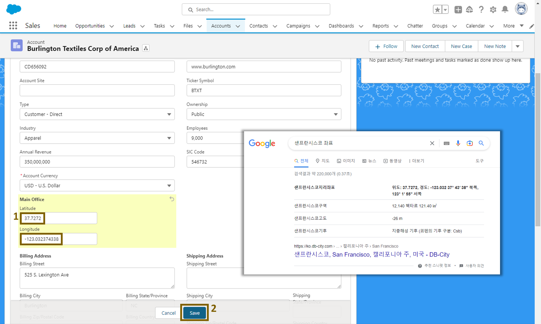 위도와 경도 좌표를 입력해 줍니다. 강의에서는 세일즈포스 본사가 있는 미국 샌프란시스코의 좌표를 넣었습니다.