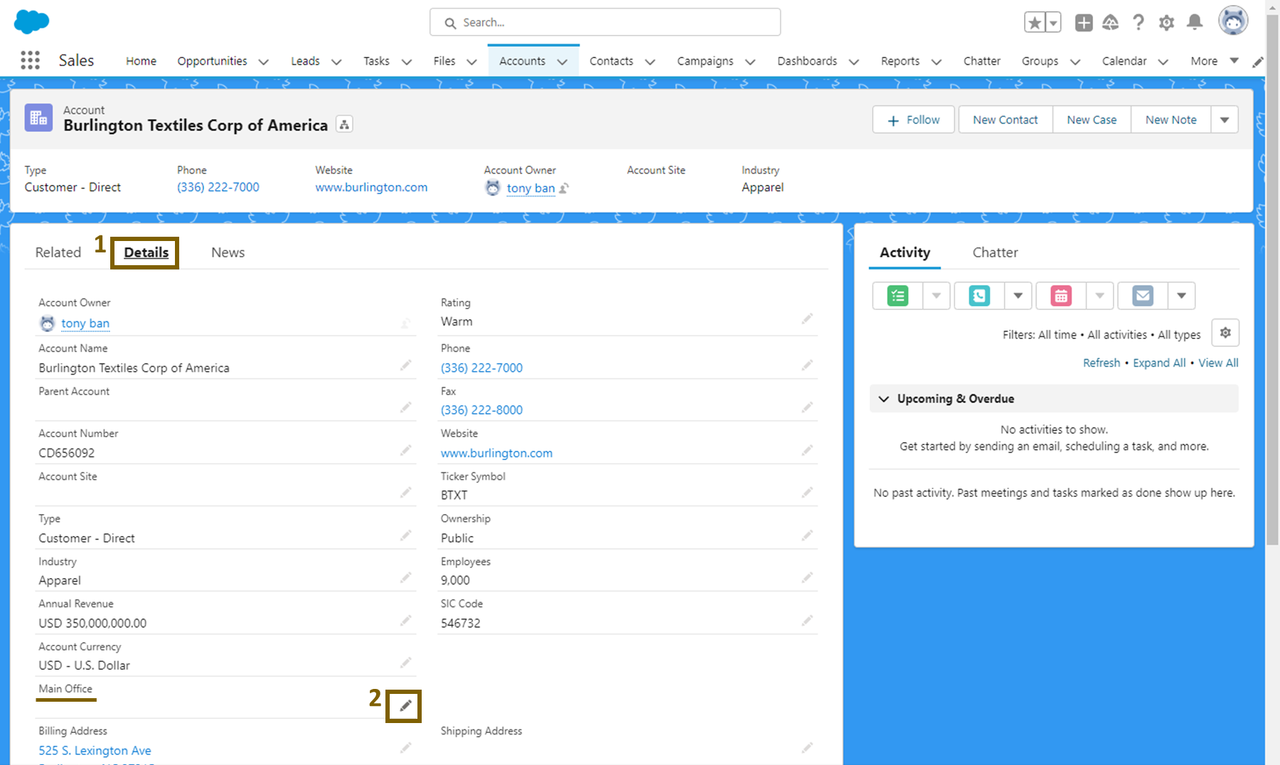 'Details'탭을 클릭하고, 'Main Office'의 연필 모양 아이콘을 클릭합니다.