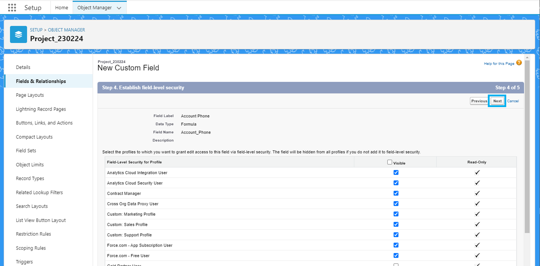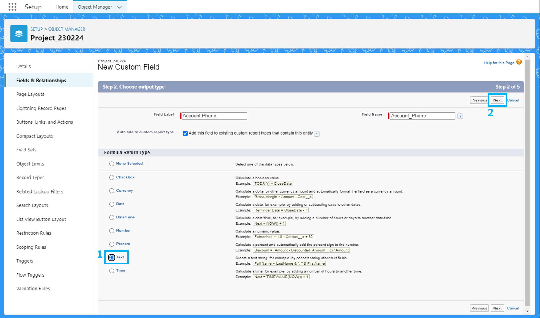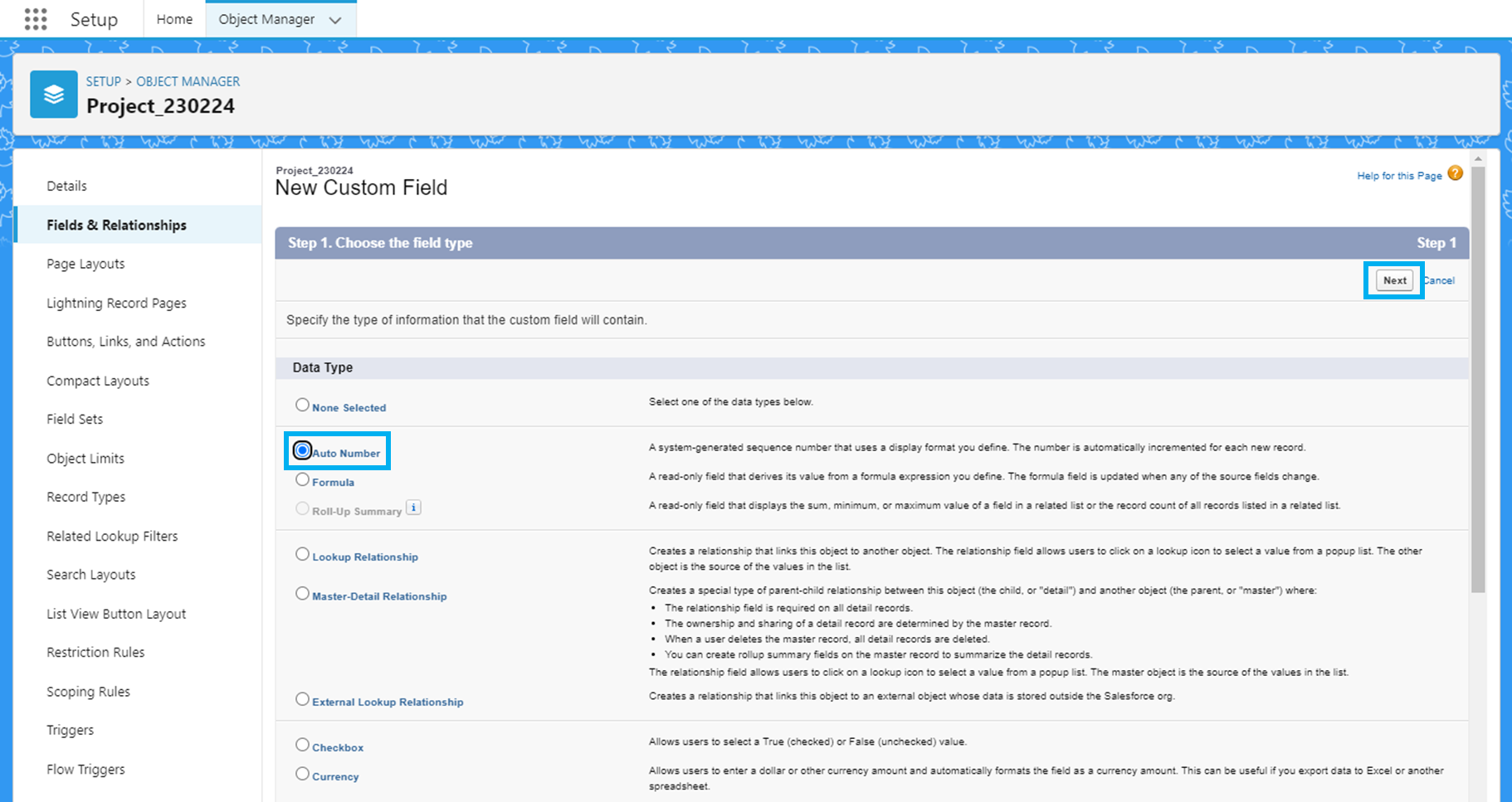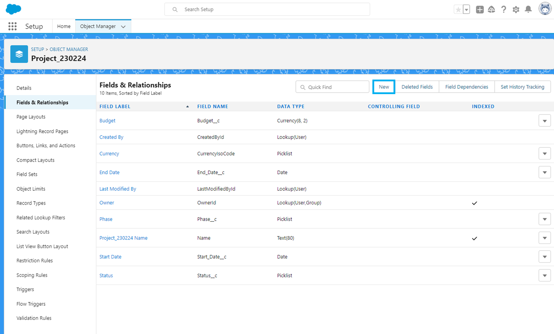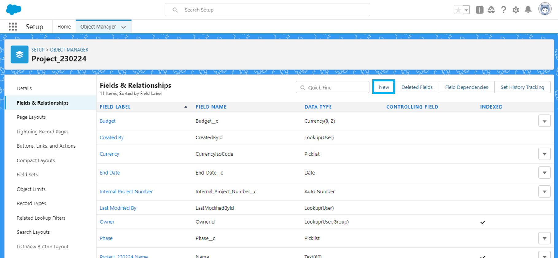 프로젝트 객체의 Object Manager - Fields & Relationship에서 'New'를 클릭합니다.
