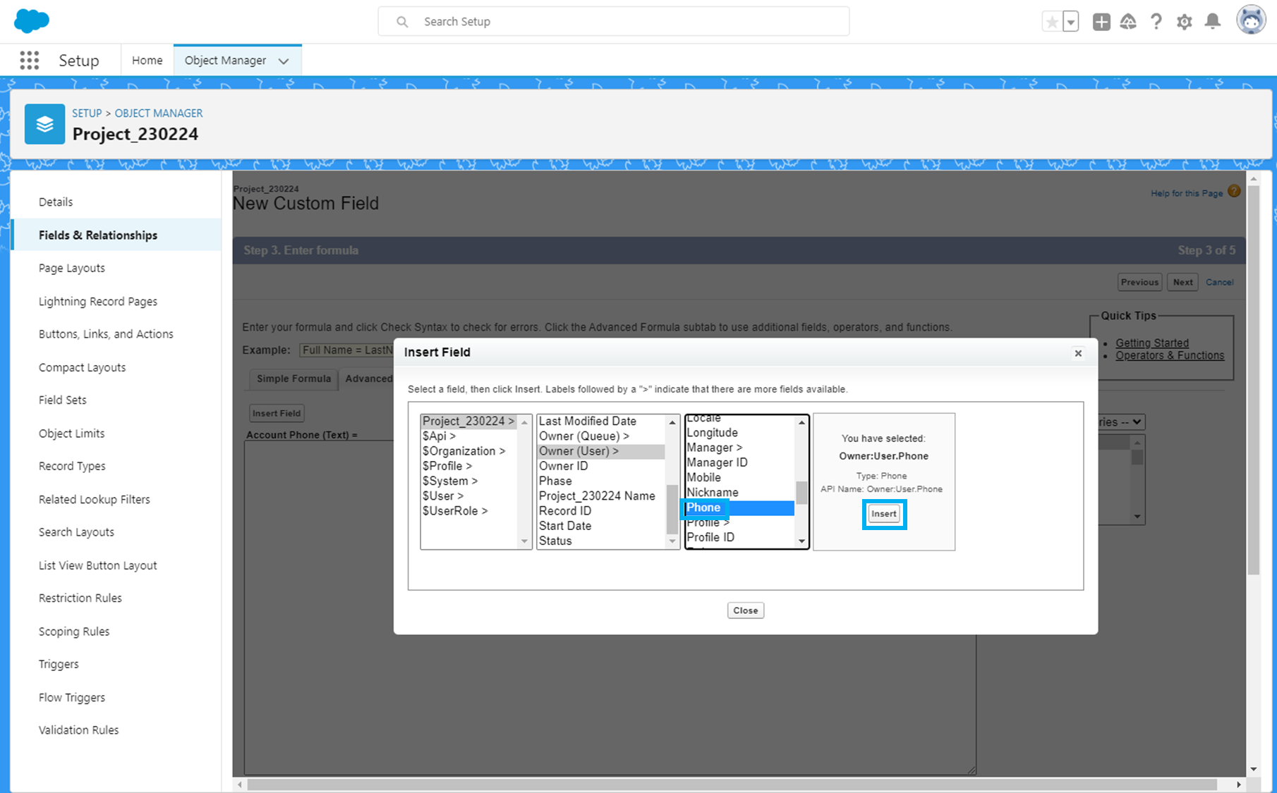 그렇다고 좌절하면 안될 것 같습니다. 결국 'Phone'은 User 쪽에서 찾았습니다. 'Insert'를 클릭해 줍니다.