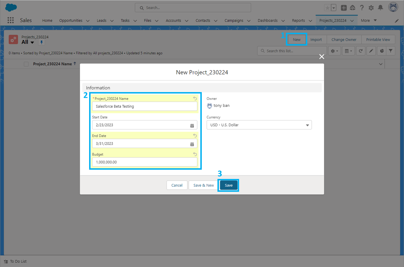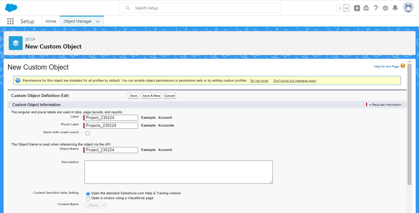 새로운 커스텀 필드가 있는 커스텀 객체 생성(custom object)