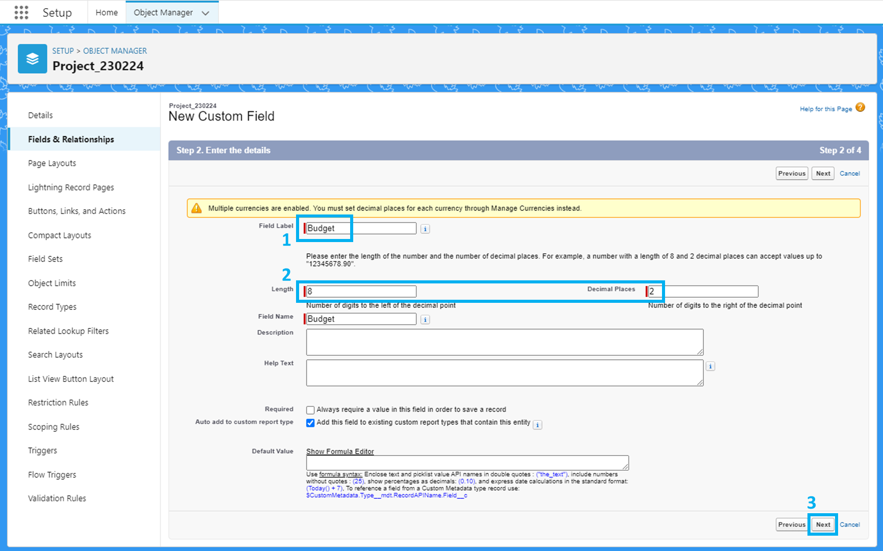 'Next' 클릭 - 'Next' 클릭 - (커스텀 필드 생성이 끝났으므로) 'Save' 클릭.