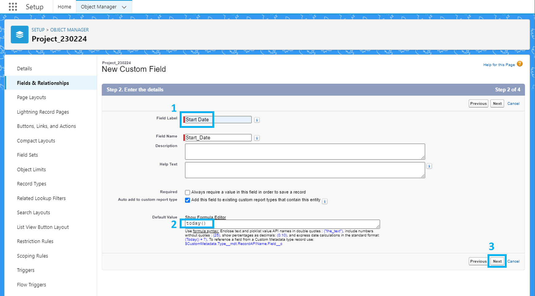 'Next' 클릭 - 'Next' 클릭 - (커스텀 필드 생성이 끝났으므로) 'Save' 클릭.
