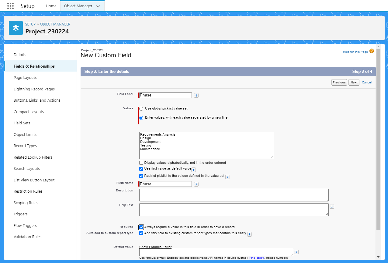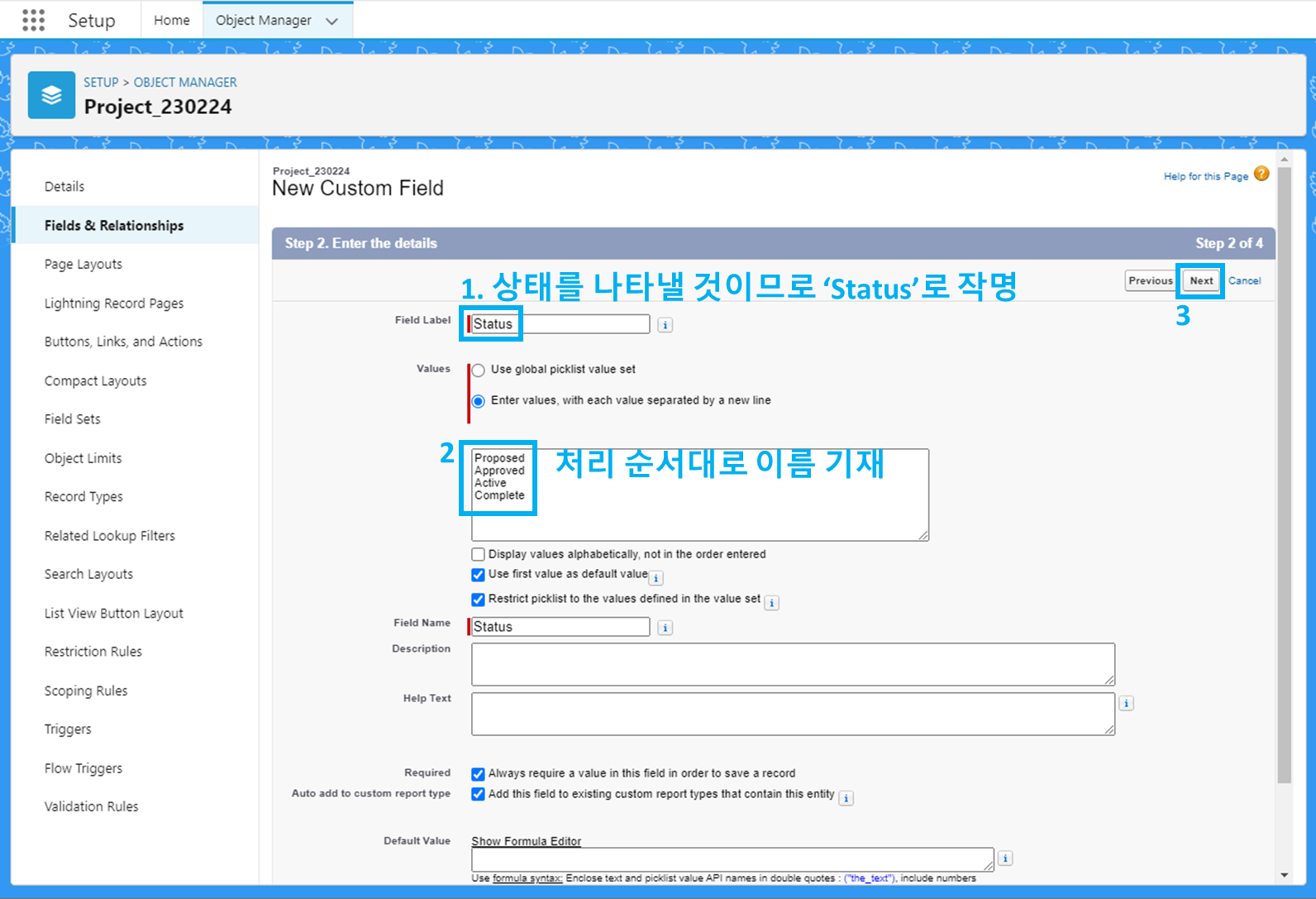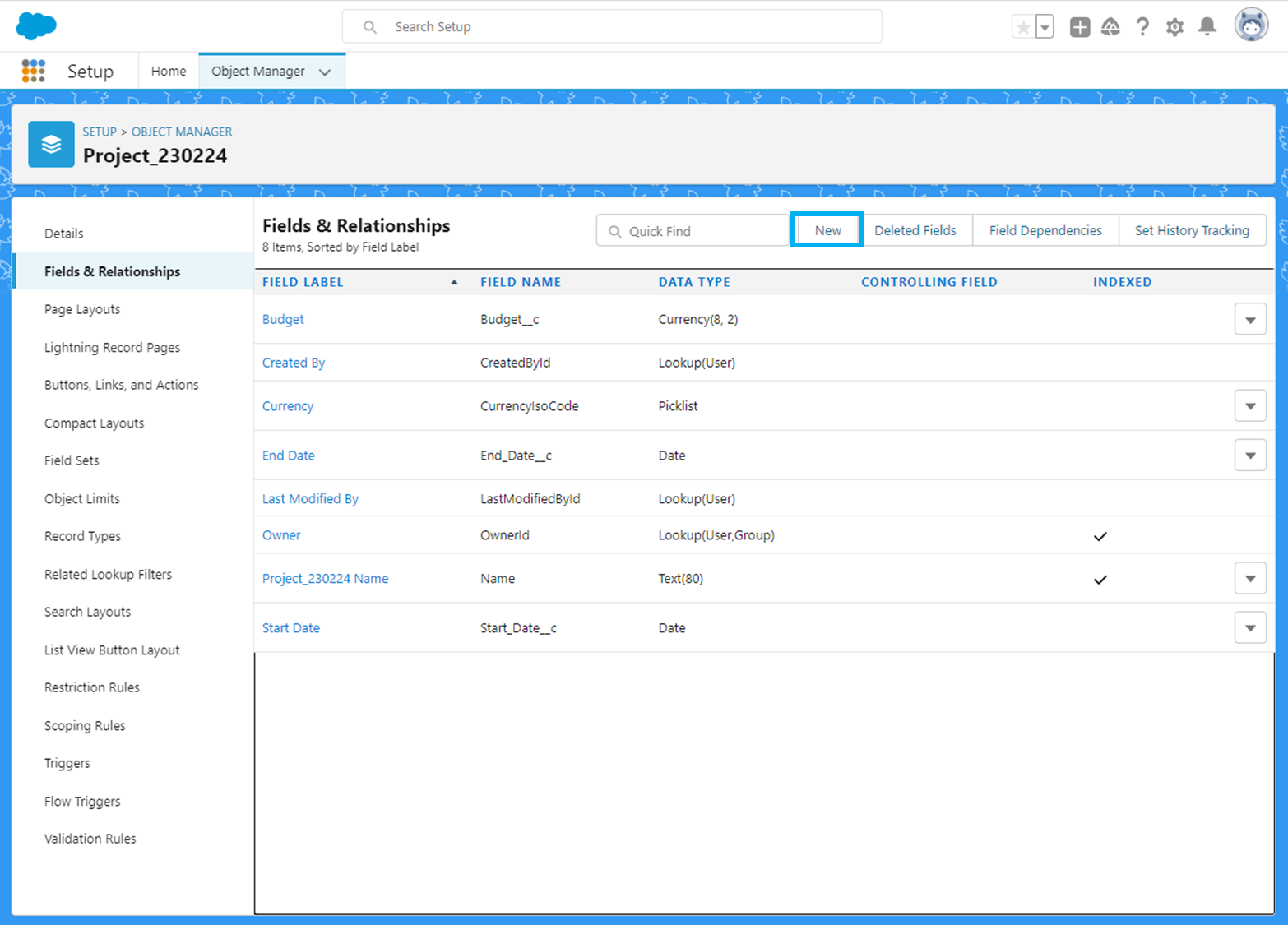 setup에서 ObjectManager 검색, 오늘 생성한 프로젝트 클릭 - Fields & Relationships 클릭 후 'New'클릭