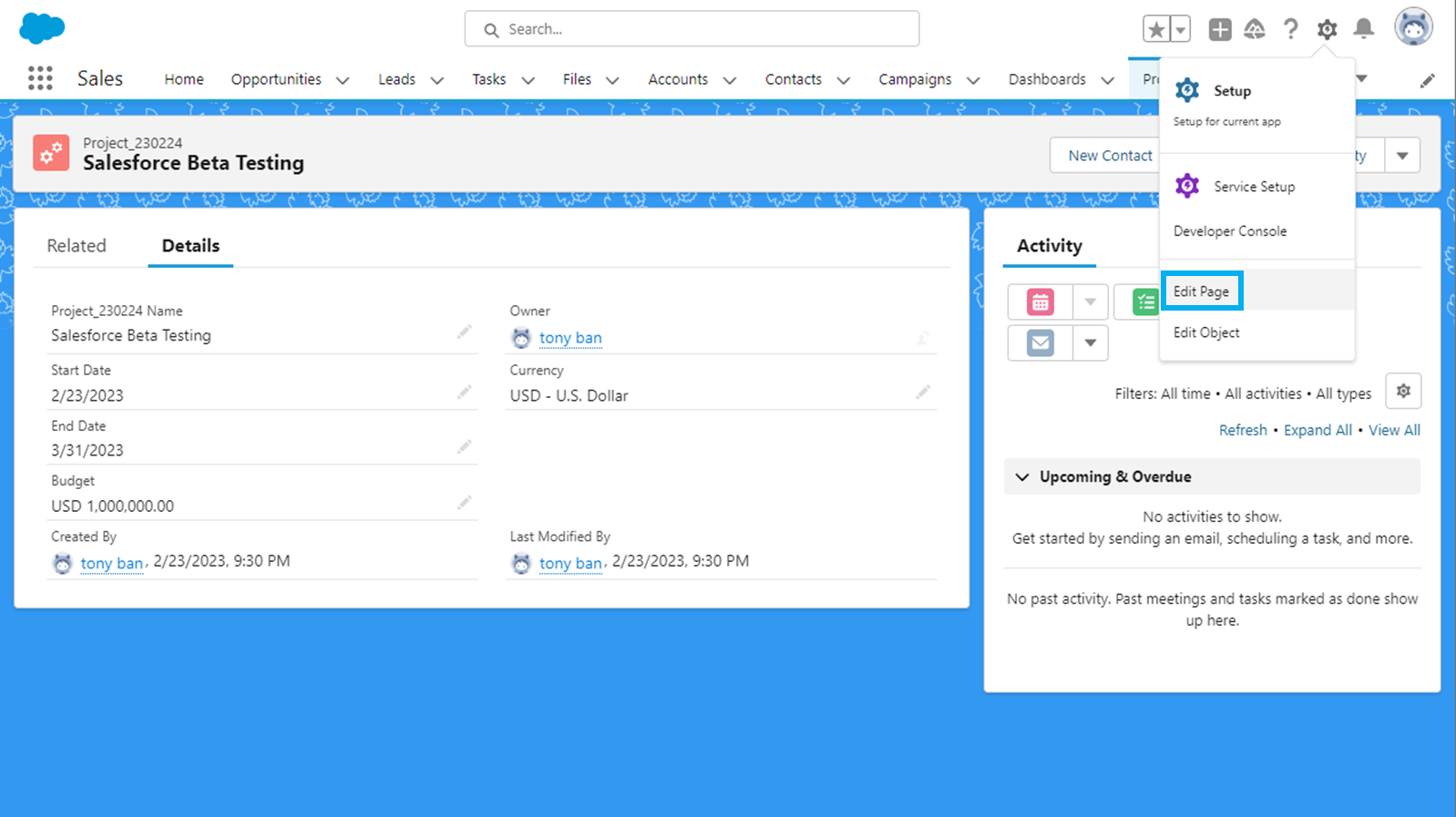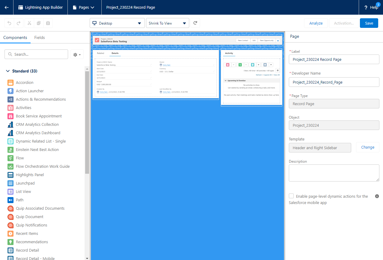 'Edit Page'를 눌러 세일즈포스에서 제공하는 라이트닝(Lightning) 페이지로 이동합니다.
