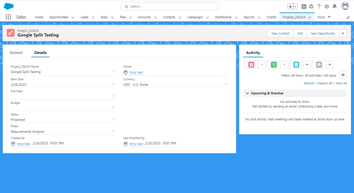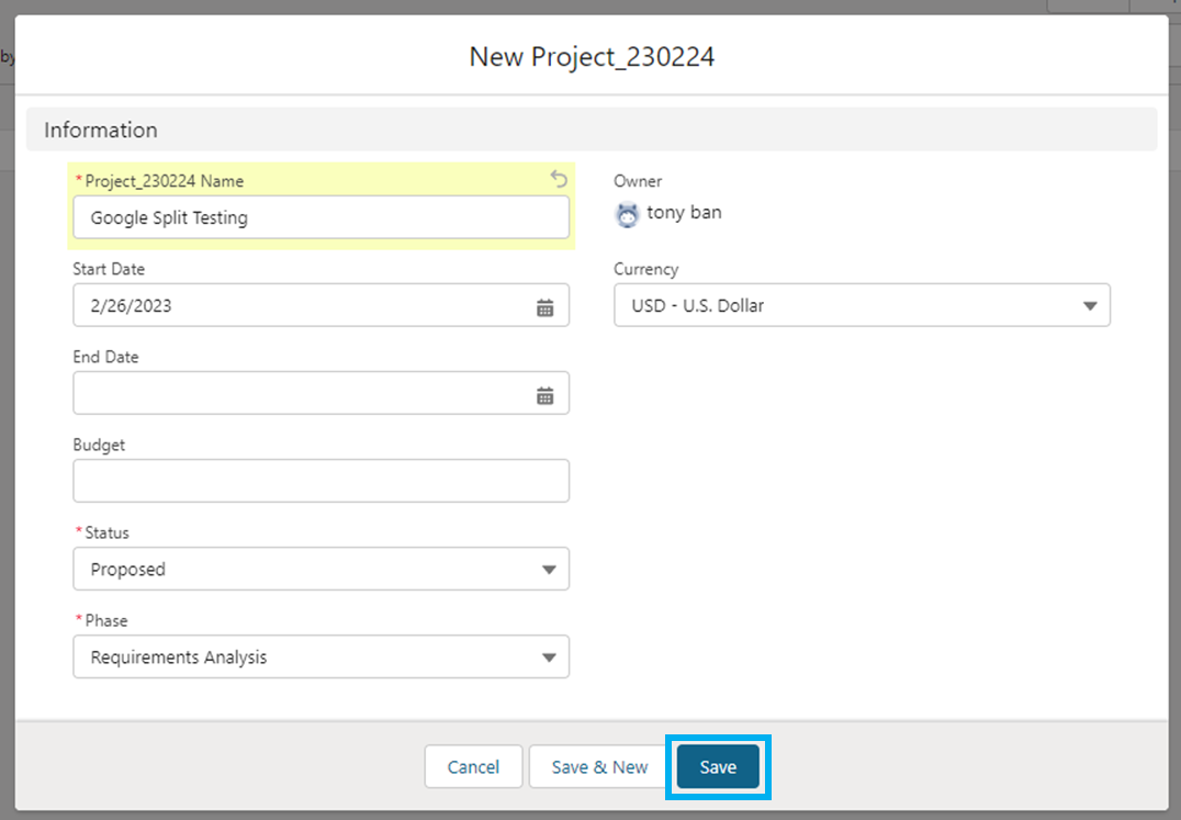 필드 종속성 테스트를 위해 새로운 프로젝트 레코드를 생성해 줍니다.