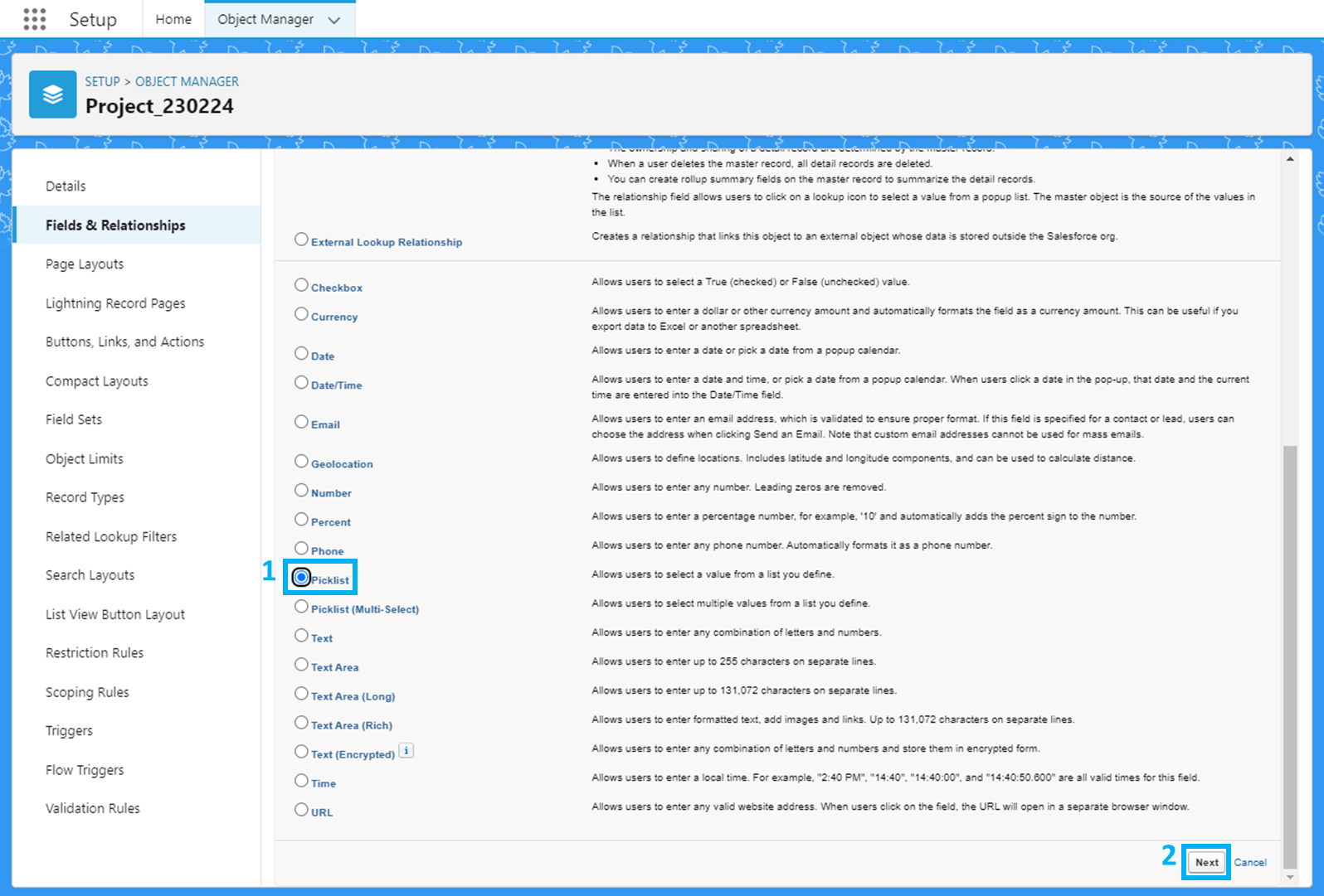 'Picklist' 선택 후 'Next' 클릭