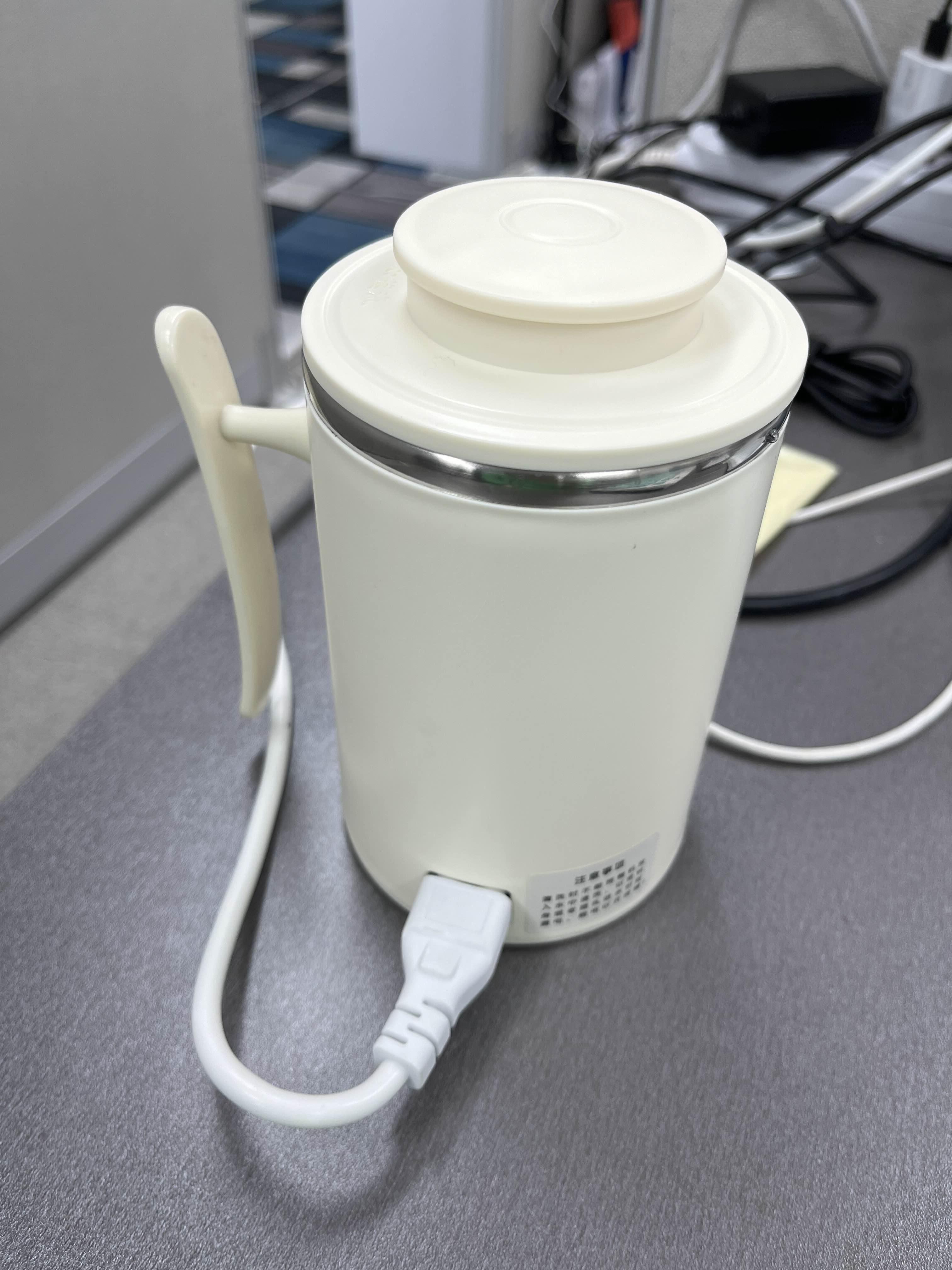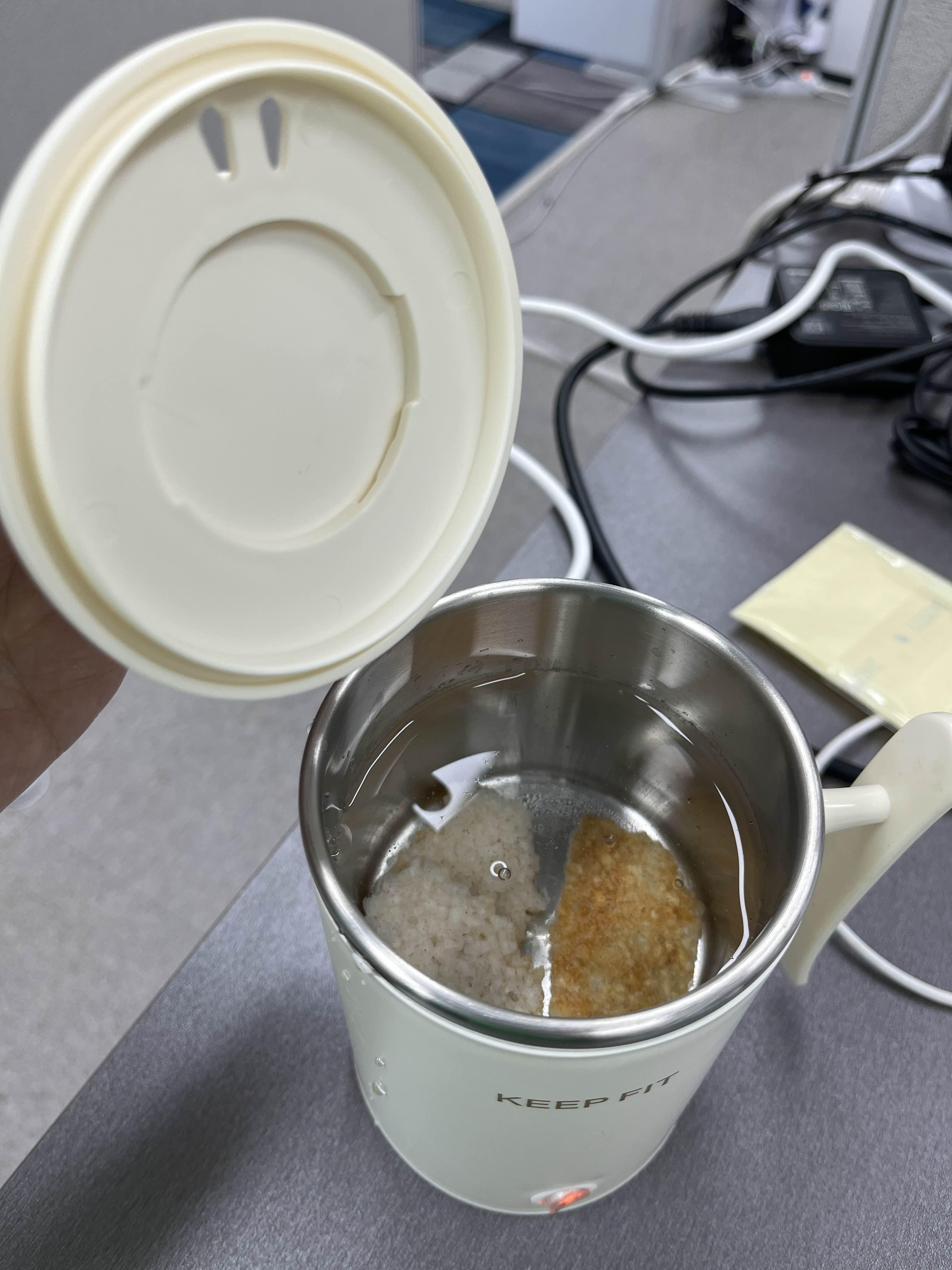 첫 작동은 사무실 제 책상 위에 두고 누룽지를 끓여봤습니다. 뭘 끓여볼 까 하다가 아침에 일찍 출근하는 편인데 출출하기도 하고, 누룽지가 생각나더라고요. 집에서 미리 준비해 간 누룽지 3조각을 넣고, 물은 약 300ml 정도 넣고 끓였습니다. 뚜껑은 플라스틱입니다. 보온 도시락처럼 돌려서 잠글 수 있는 게 아니고 마치 냄비 뚜껑처럼 얹어 놓는 구조입니다. 이 글을 보고 미니 전기 주전자를 사야겠다고 생각하신 분들은 2~3만 원 정도 하면 더 좋은 기능이 있으니 그걸로 구매하시면 좋을 것 같습니다. 대용량 배터리가 들어 있어서 분유통처럼 휴대하기 좋은 것도 있더라고요. 샤오미 제품이 좋아 보였는데 약간 비싼 느낌... 대륙의 실수 샤오미, "샤오미 전기 주전자"로 검색해 보면 많은 정보를 얻을 수 있을 것 같습니다.