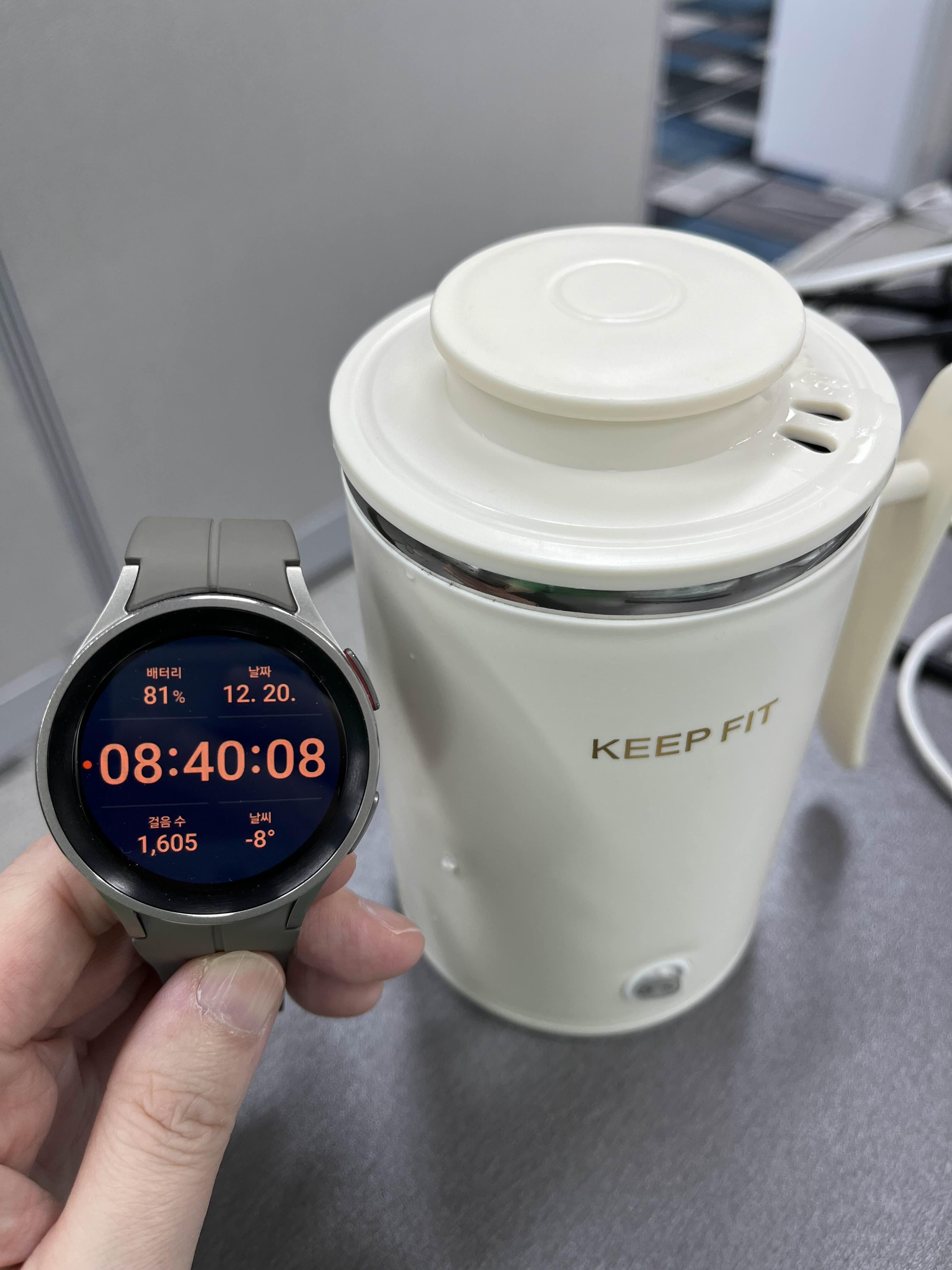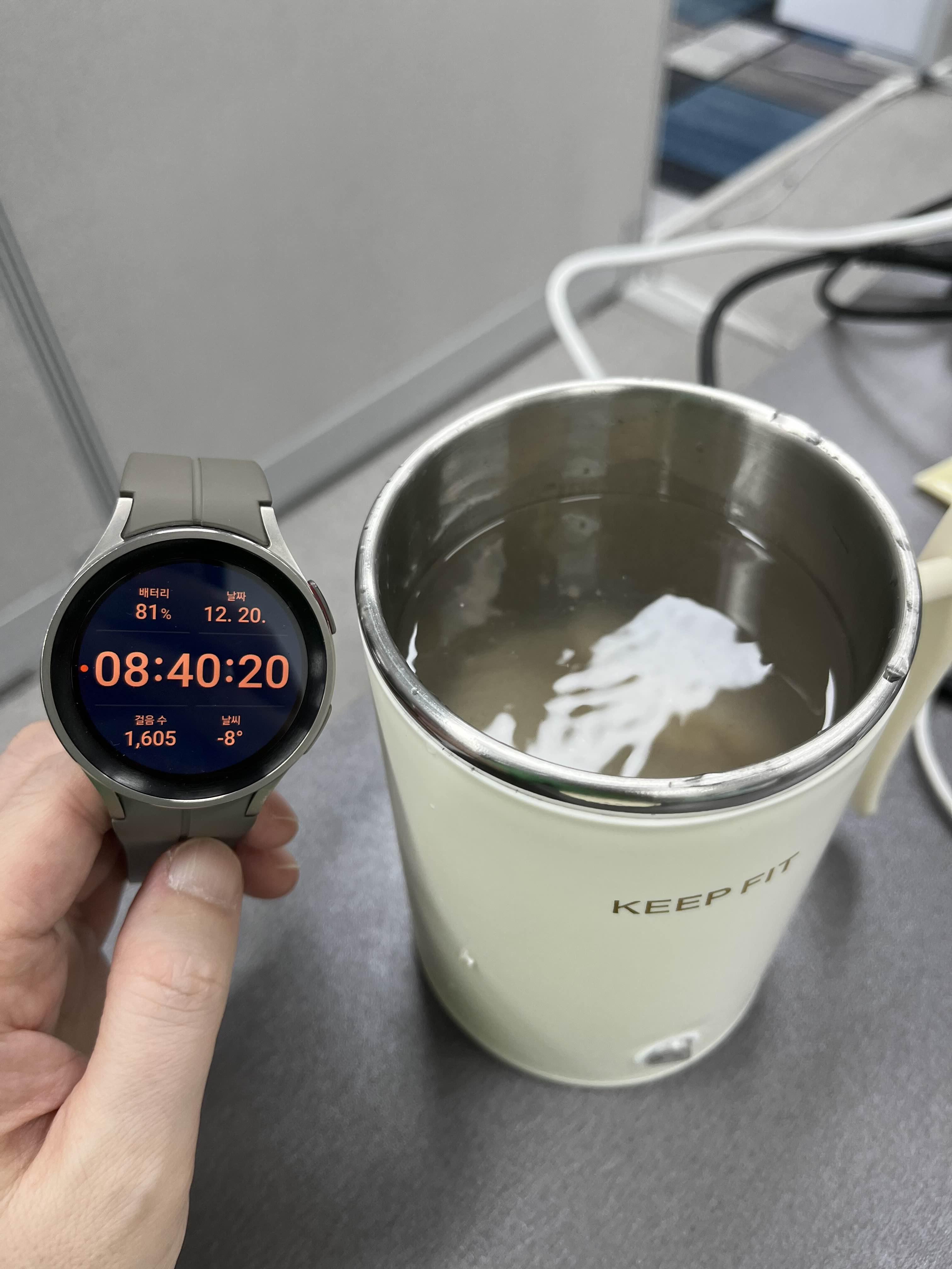 물이 끓는데 어느 정도 시간이 걸리는지 갤럭시워치 5로 시간을 측정해 봤습니다. 아침 08:40분에 스위치를 켰습니다.