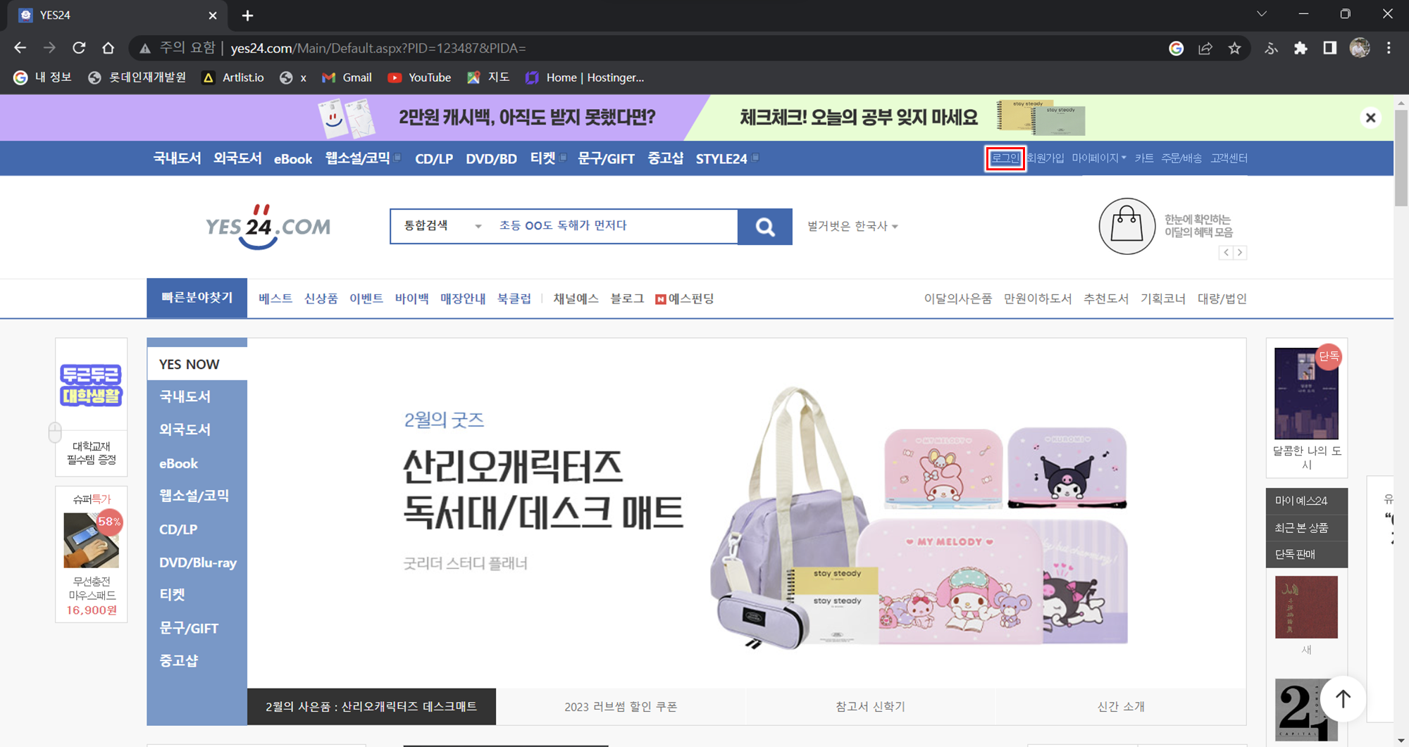 1. YES24 홈페이지 접속 후 로그인