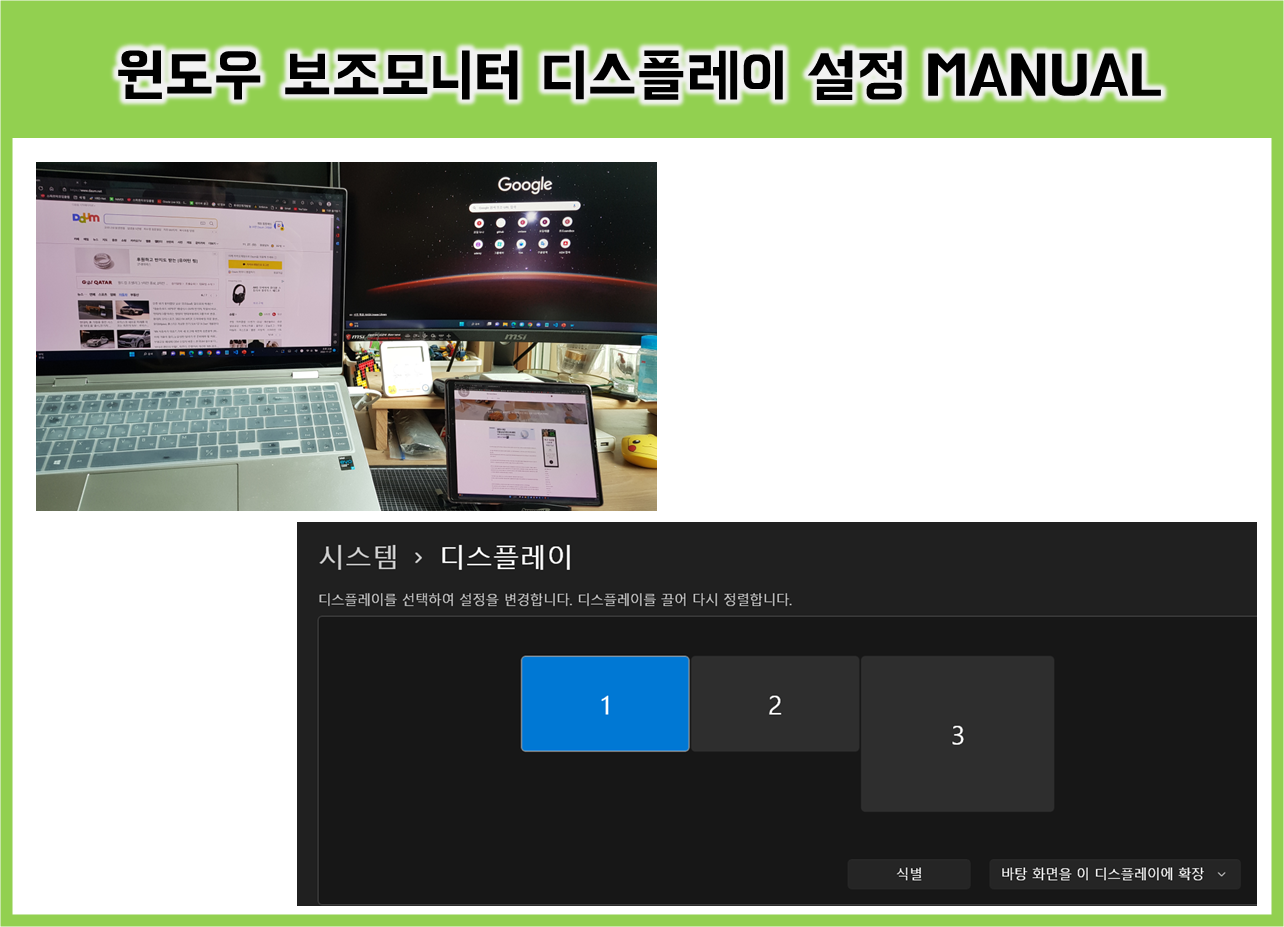 '식별' 버튼을 클릭해 보면 현재 모니터가 설정된 상황을 알 수 있음