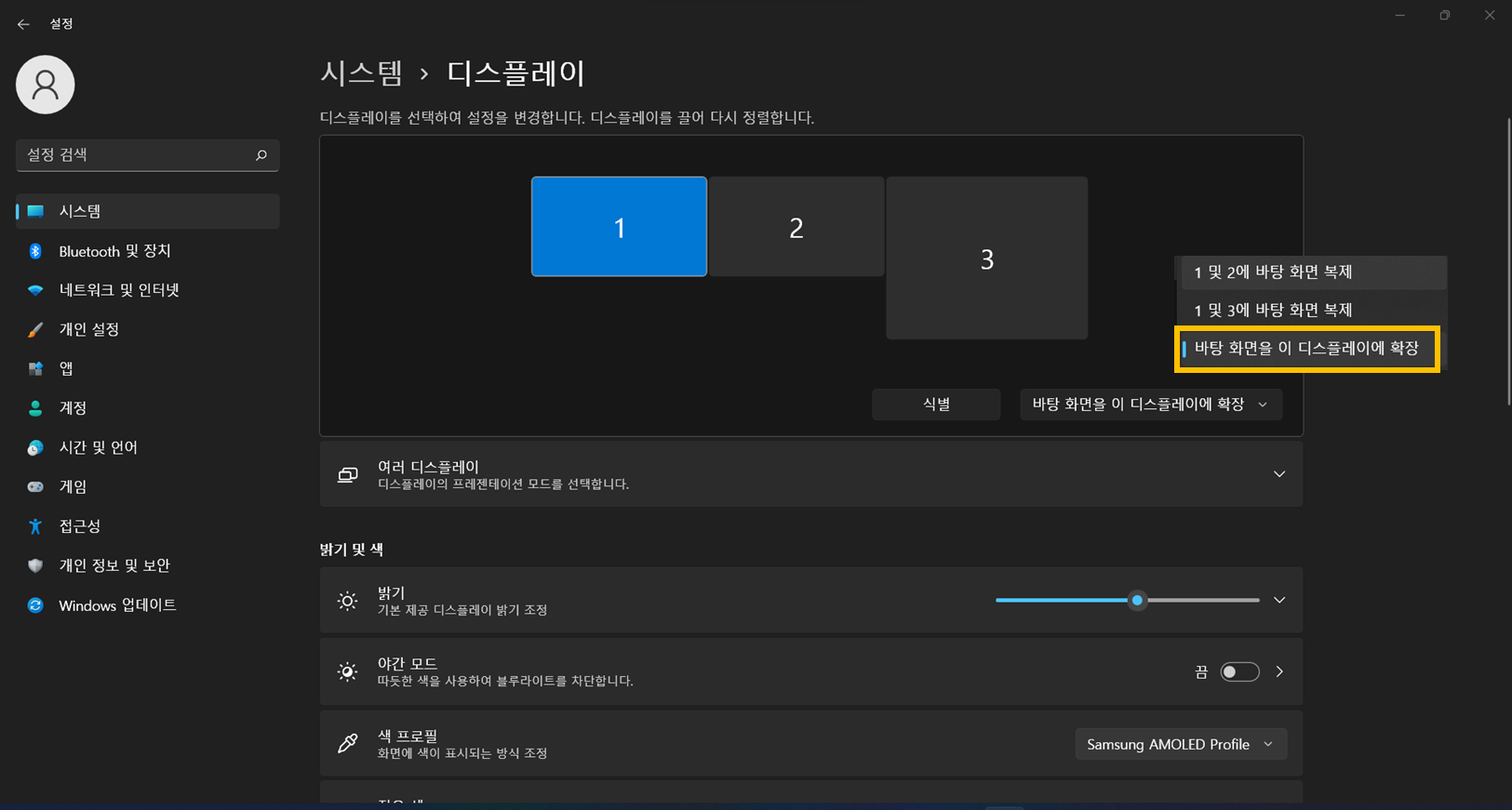 ▶ 바탕 화면을 이 디스플레이에 확장 : 3개의 모니터를 각각 사용할 수 있음