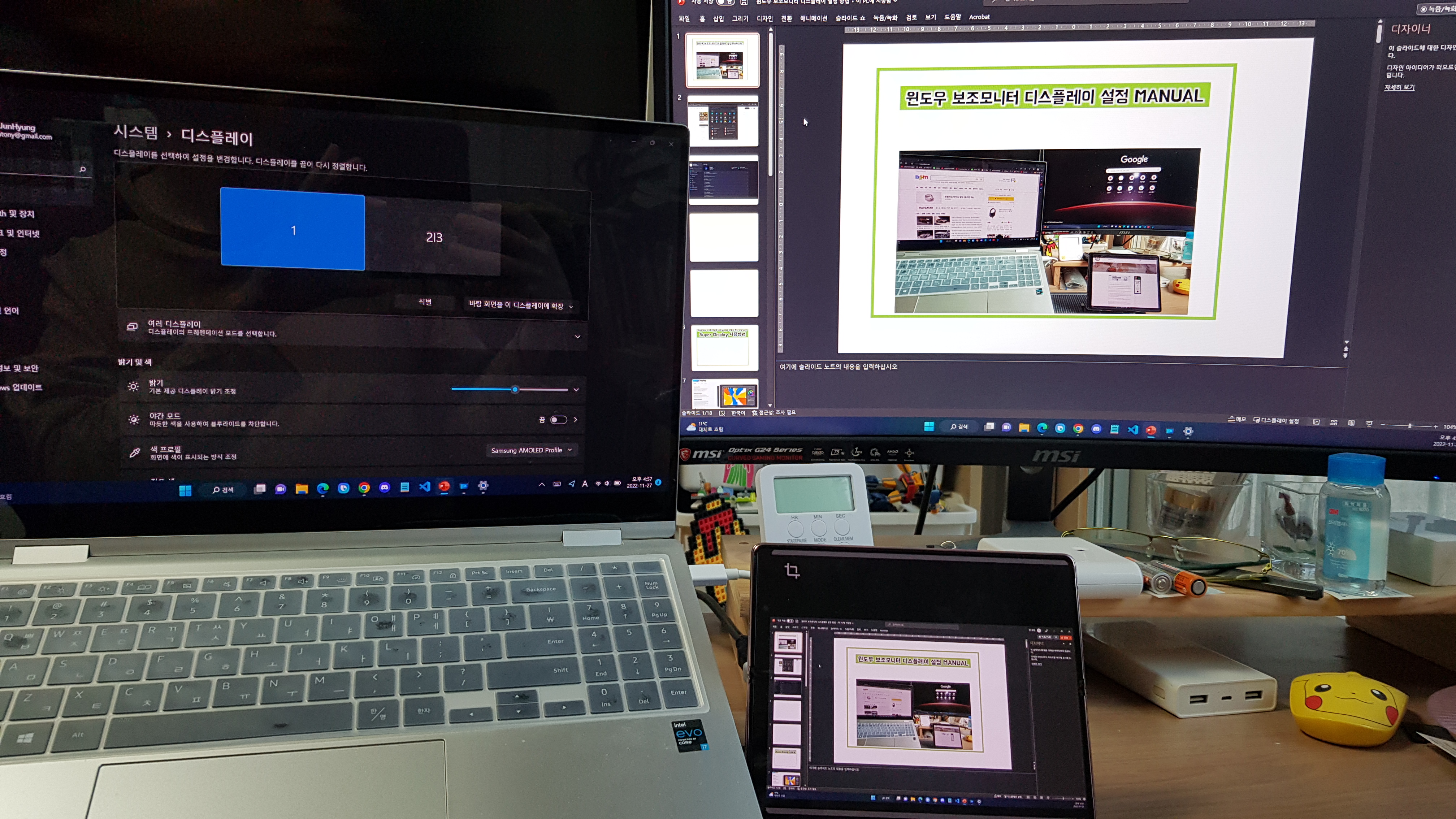 오늘은 이렇게 다양한 방법으로 사용할 수 있는 보조 모니터를 어떻게 설정하는지에 대한 간단 매뉴얼을 소개해 드리겠습니다. 언제나 레고 매뉴얼처럼 화면 보면서 따라만 하시면 됩니다 :)