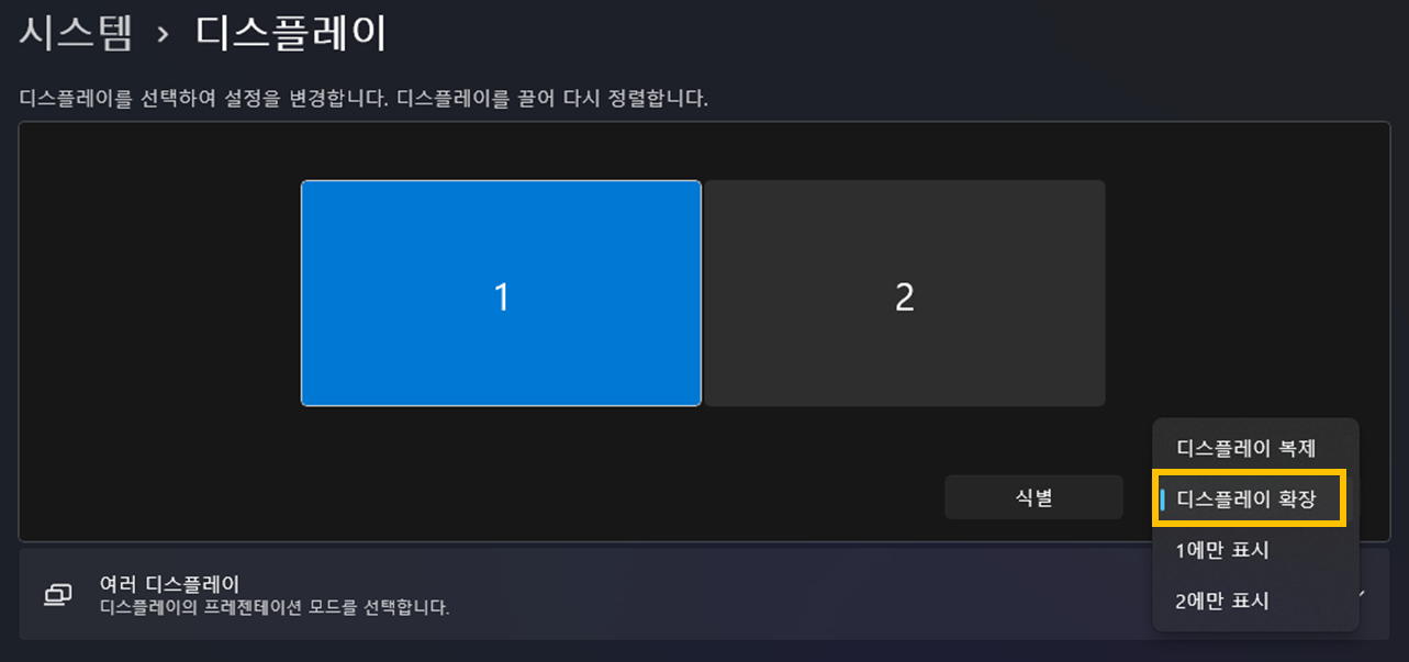 ▶ 디스플레이 확장 : 1번과 2번 모니터 각각 사용 가능