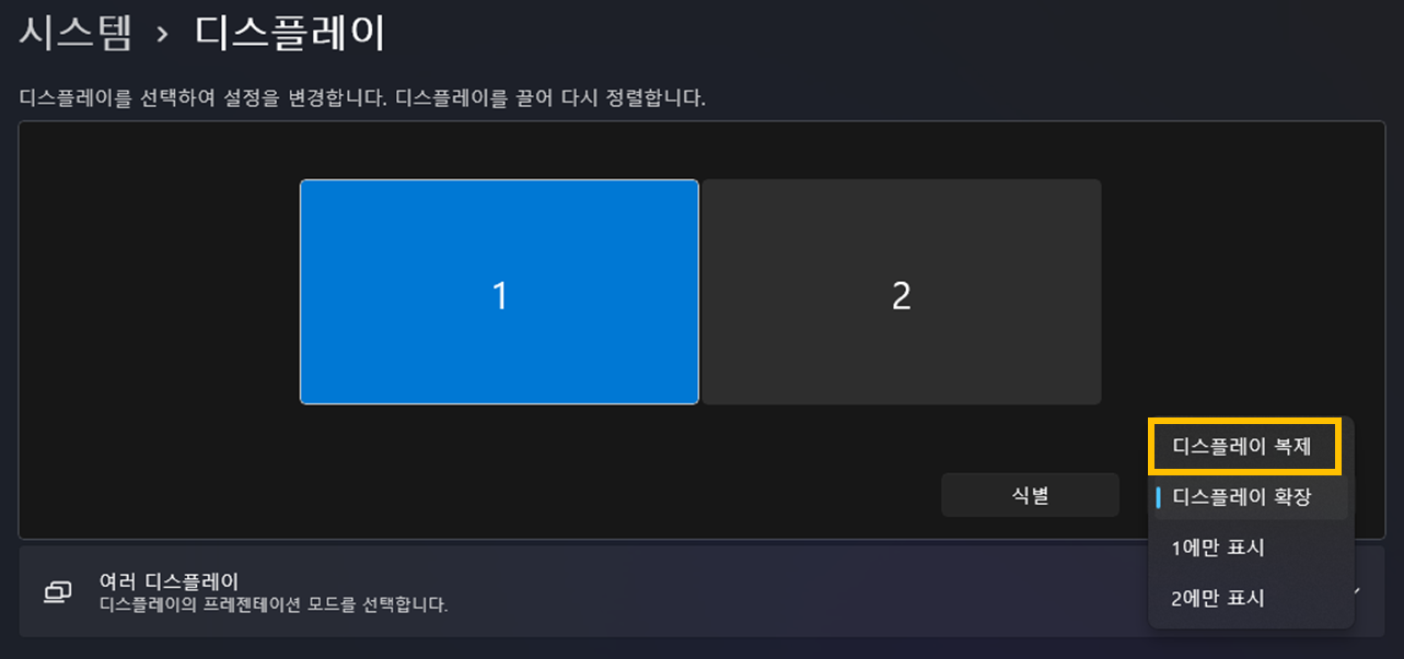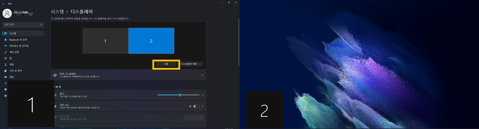→ 현재 왼쪽이 1번 모니터, 오른쪽이 2번 모니터로 설정되어 있음