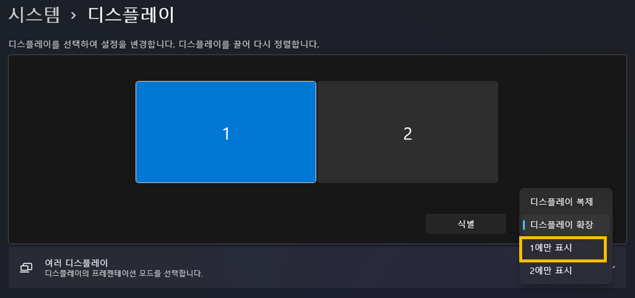 ▶ 1에만 표시 : 1번 모니터(메인 PC)만 작동하고, 2번 모니터는 화면이 꺼짐
