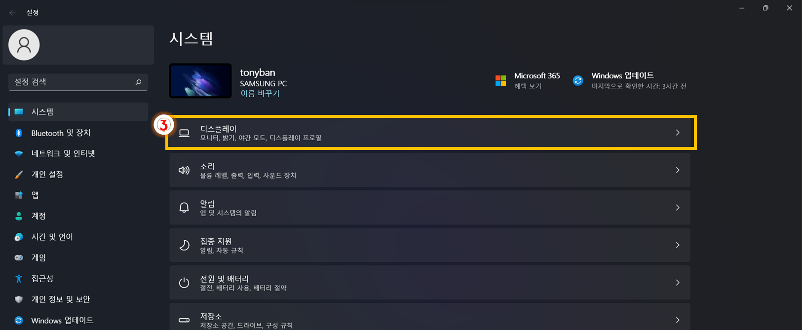 ▶ 바탕 화면을 이 디스플레이에 확장 : 3개의 모니터를 각각 사용할 수 있음
