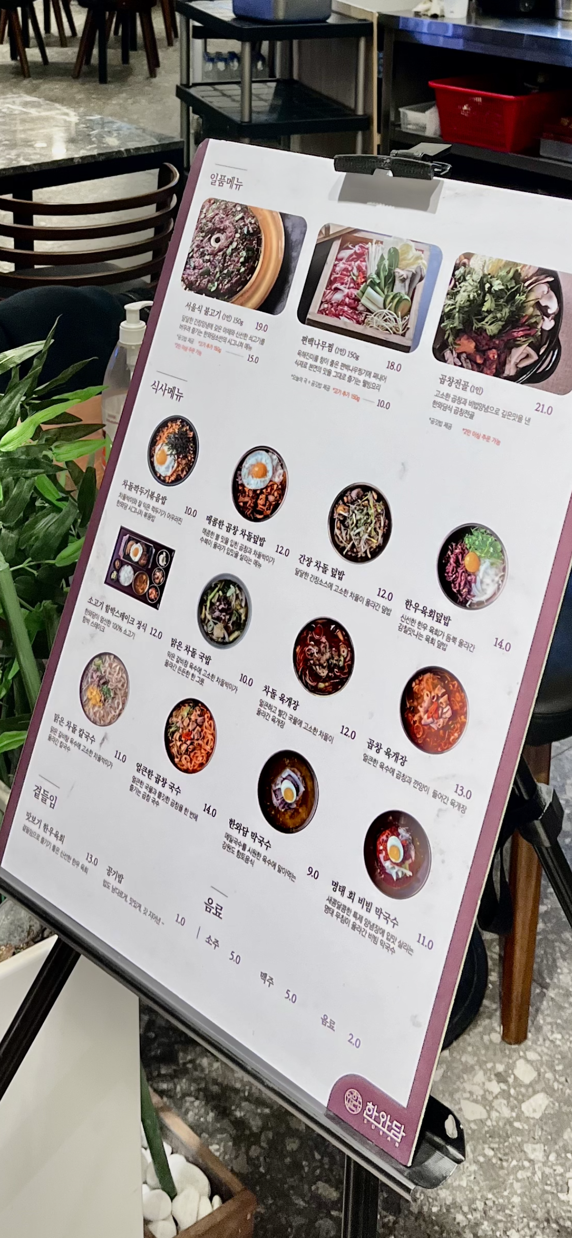 식당 출입구 메뉴판이 이젤에 걸려 있어서 식당 들어서기 전에 메뉴를 정하는 데 도움이 되었습니다. 지난번 비싸다고 생각한 부분은 불고기와 편백나무찜이었던 것 같습니다. 나머지는 만원 대 살짝 넘는 가격이었습니다.