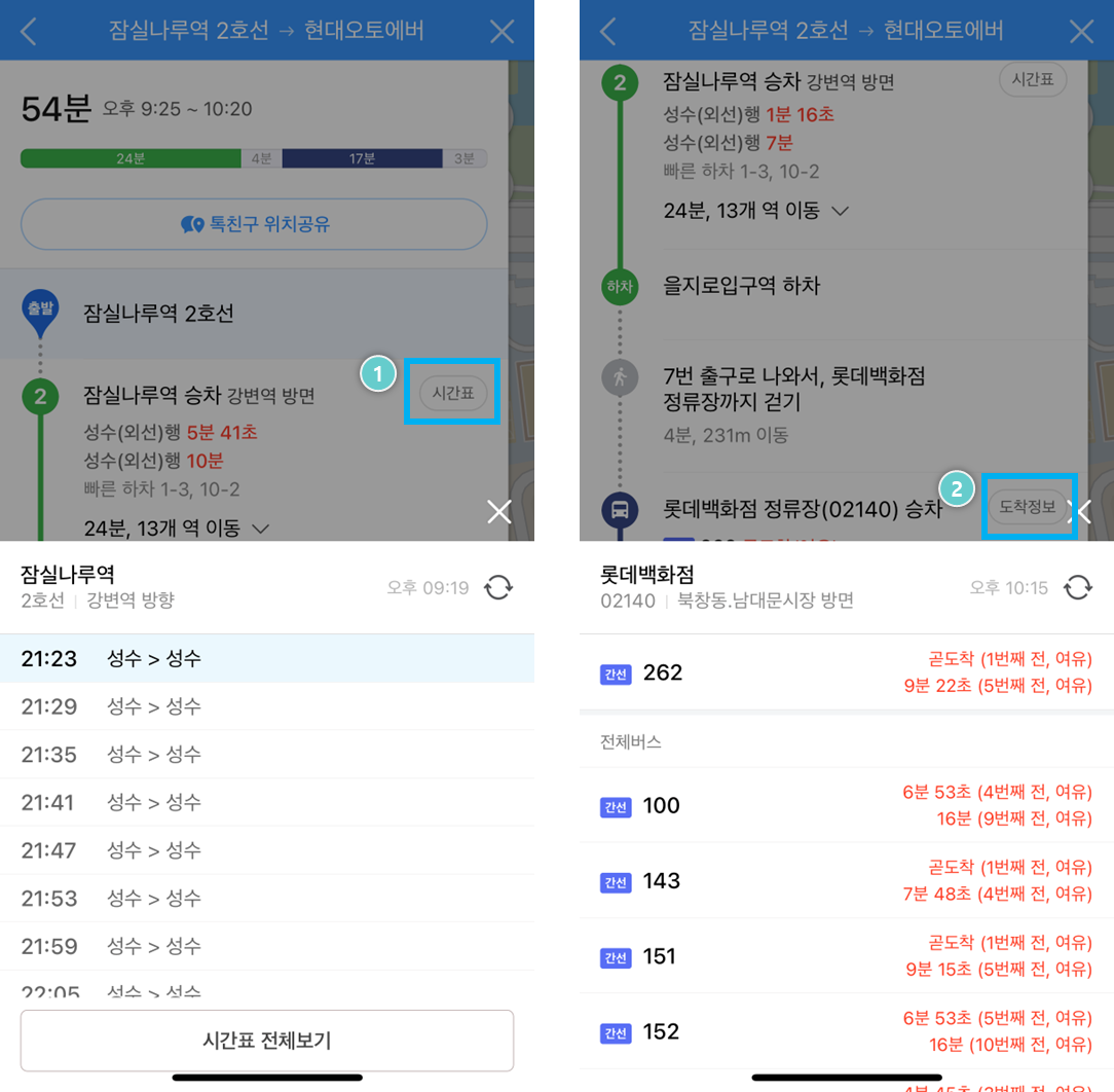 1. 시간표를 클릭하면 아래와 같이 지하철 도착 시간이 나타납니다.