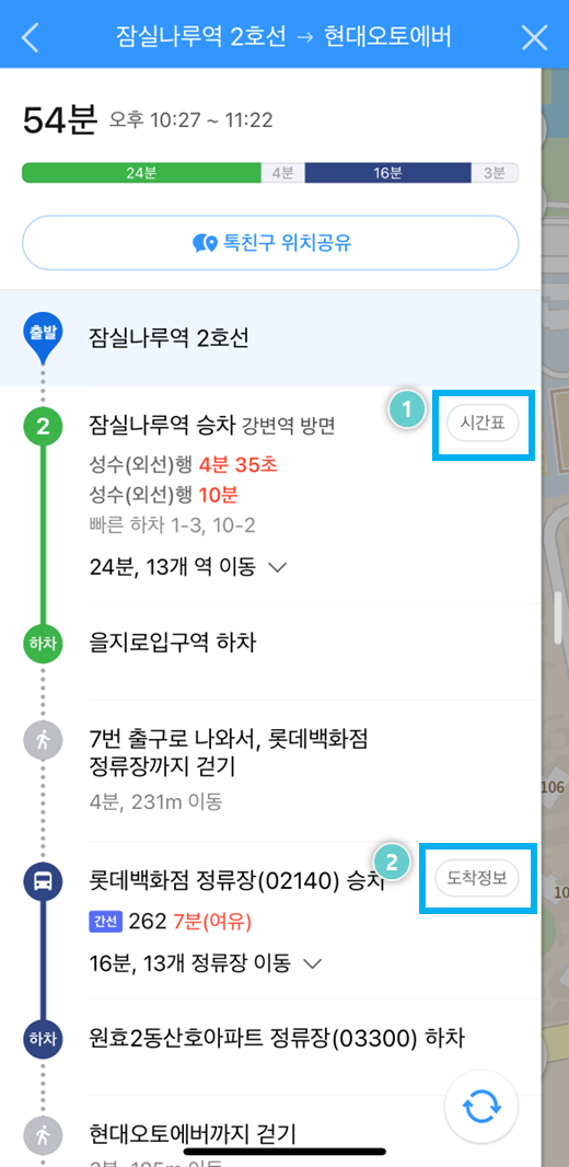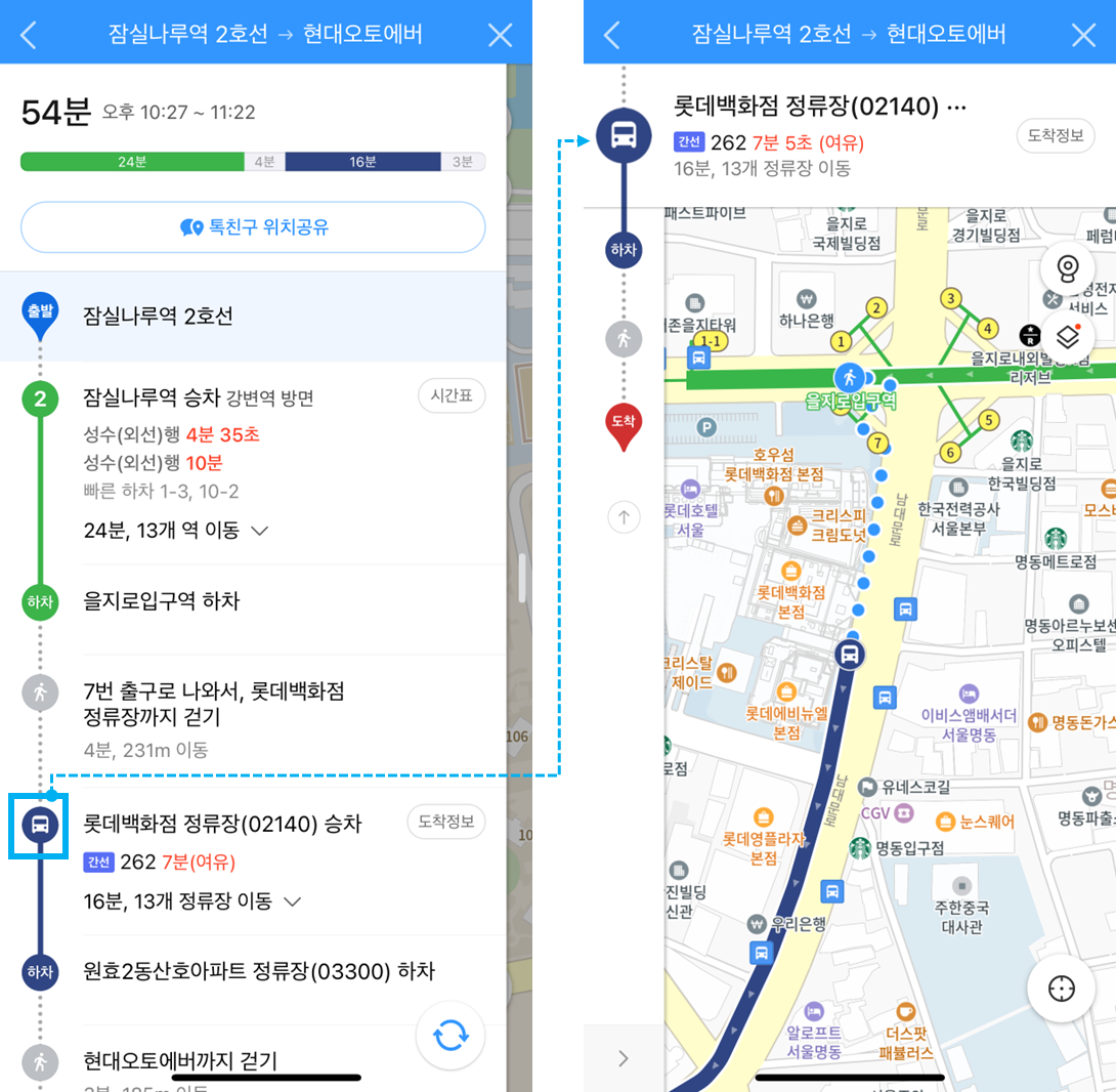 버스 모양의 아이콘을 누르면 버스정류장까지 어떻게 가야 하는지 자세히 알 수 있습니다.