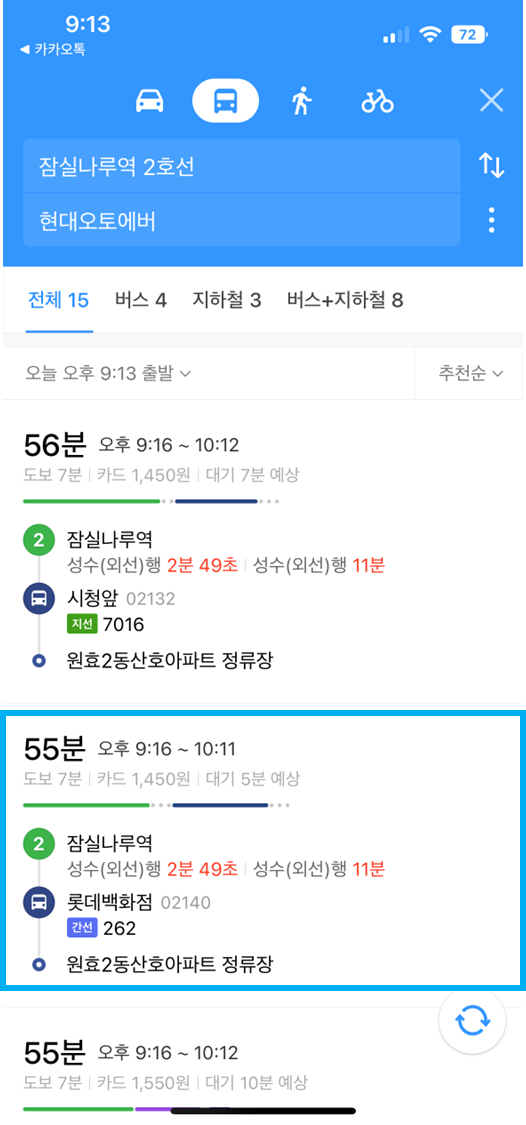 카카오맵 하나면 모든 것이 해결되는데요. 지하철이나 버스 도착시간은 물론이고 현재 이동 중인 경로까지 지도에 표시되기 때문에 지하철이나 버스 정류장 정보를 확인할 필요도 없습니다. 저는 보통 자가용을 이용하는데 어제 대중교통을 이용해 보니 정말 편리하더라고요.