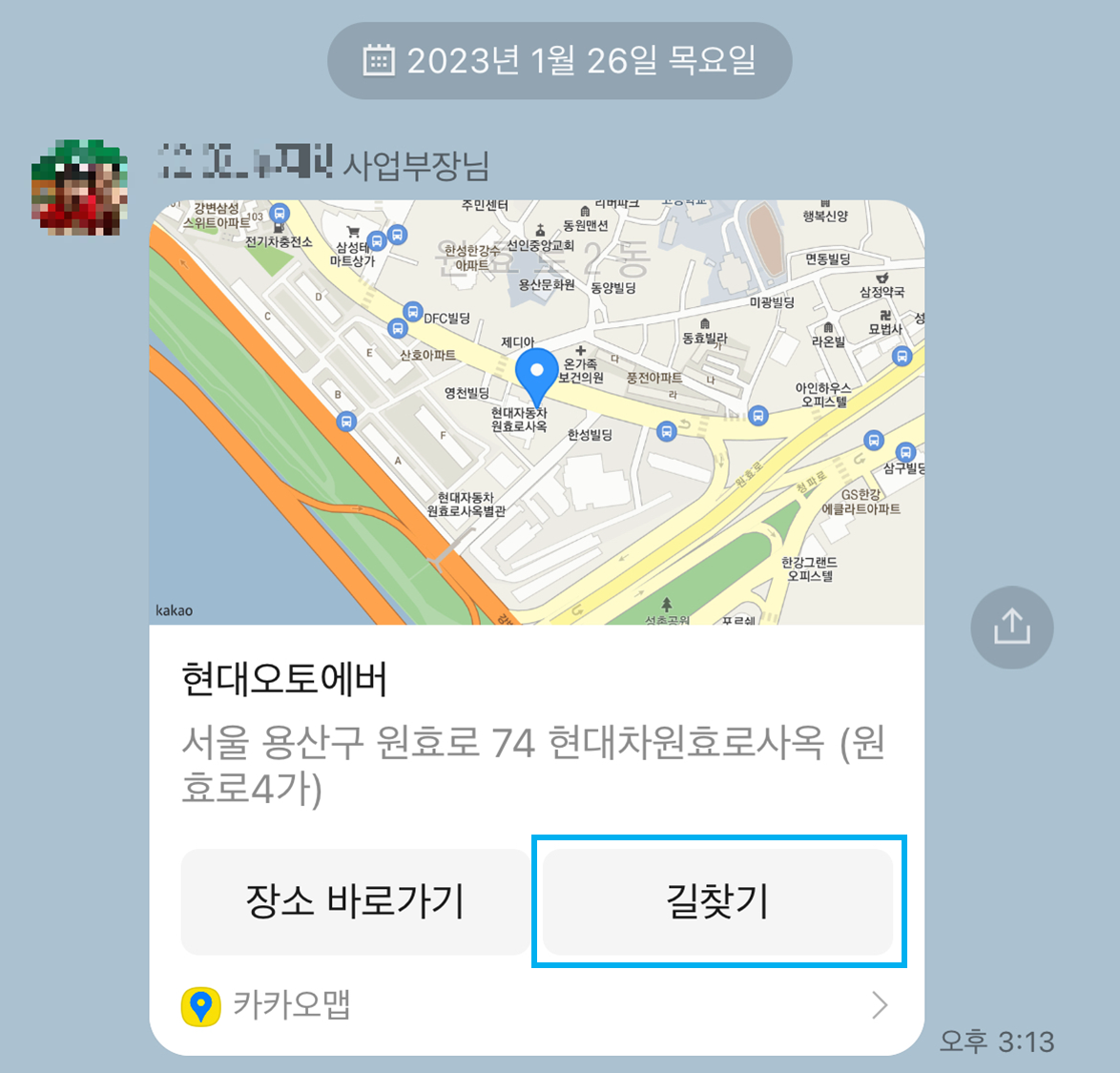 저희 회사 사업부장님께서 제가 찾아가야할 장소를 카톡으로 보내주셨습니다.