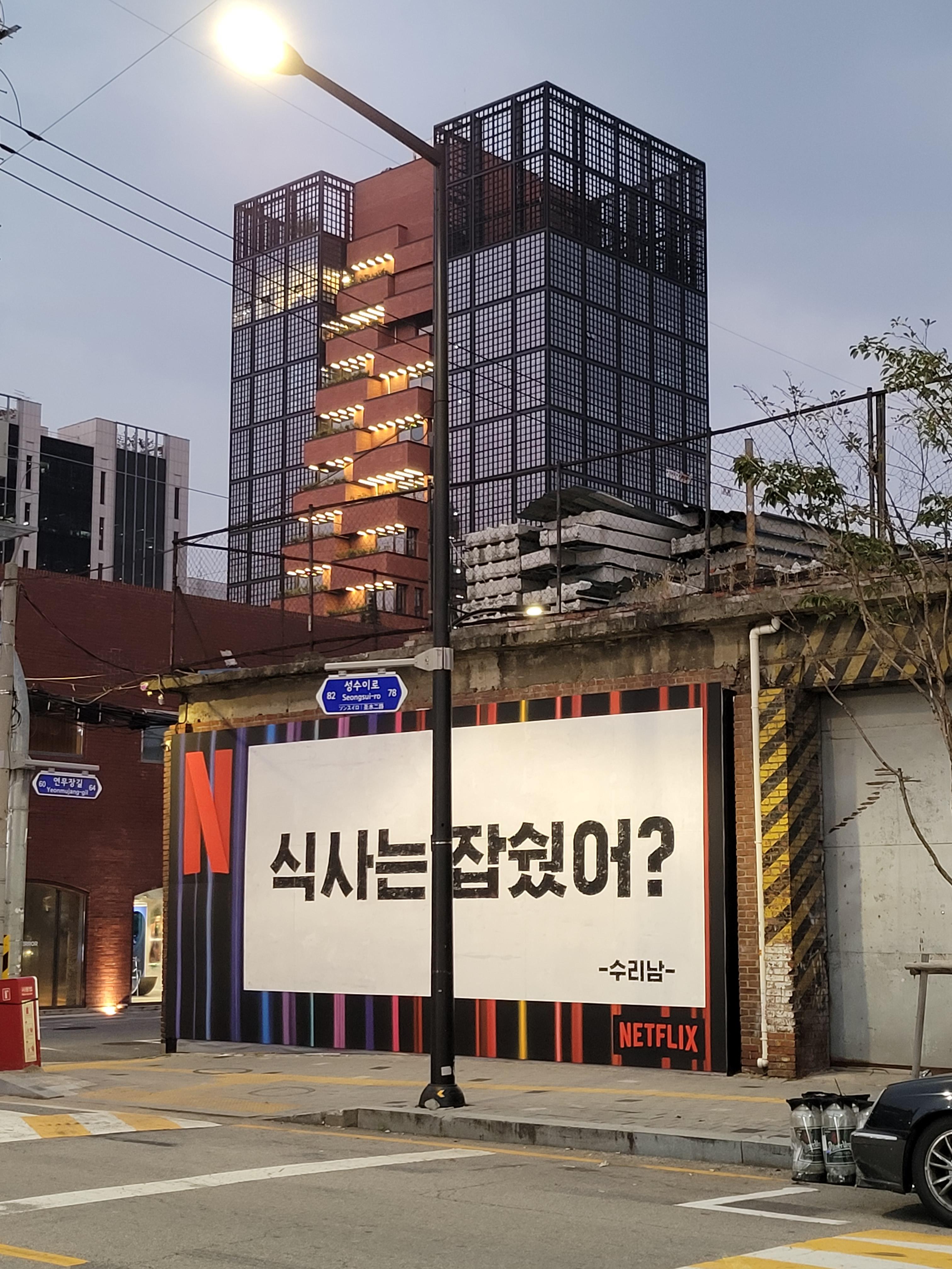식사는 잡쉈어? 저는 아직 안봤지만 수리남의 대사인가봐요. 식사는 잡쉈어 뒷편으로 보이는 아주 트렌디한 건물.