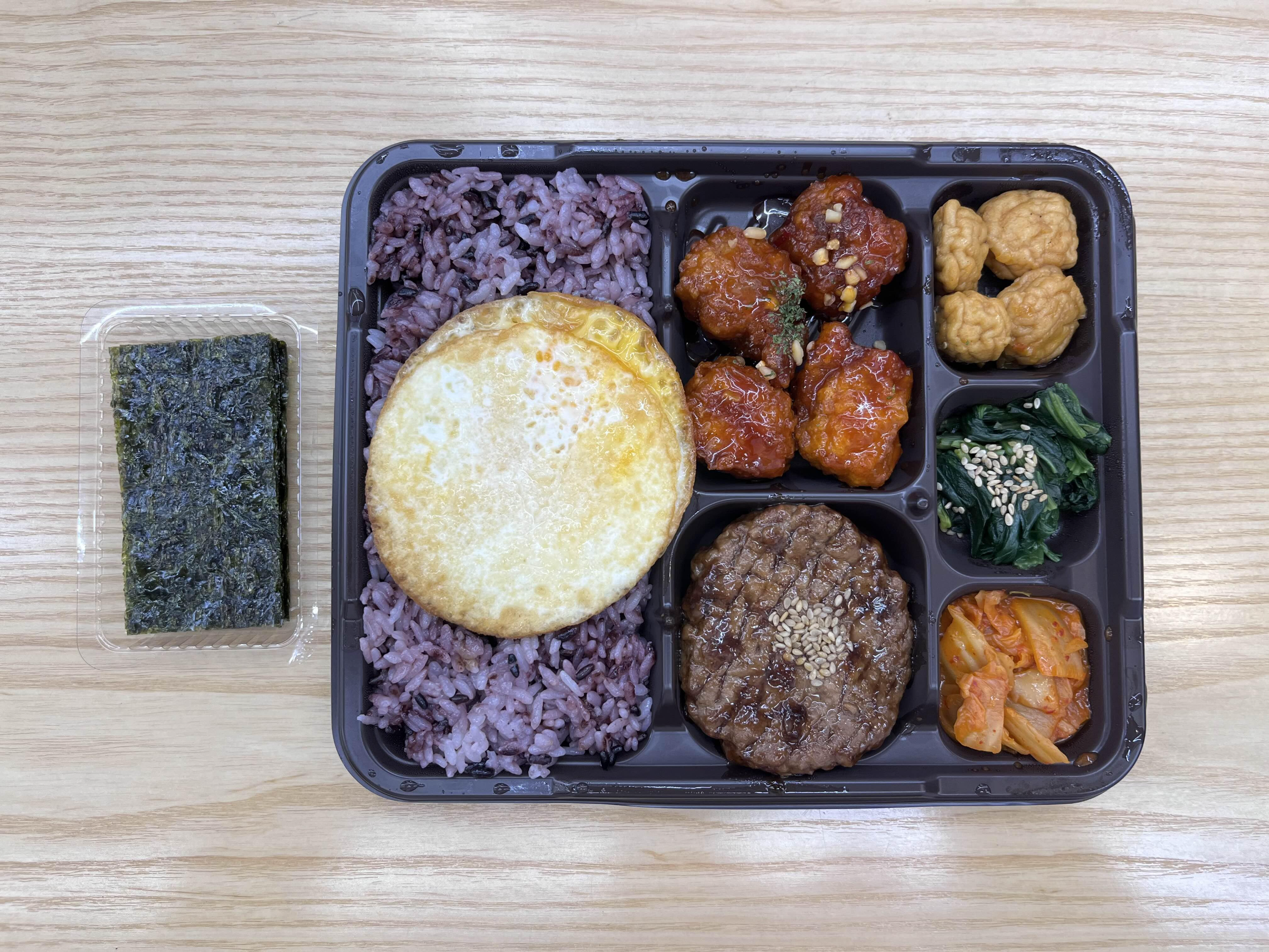 사무실 테이블에 펼쳐놓은 도시락입니다. 달걀 프라이에 떡갈비, 닭강정, 시금치나물 등 1식 7찬의 진수성찬입니다.