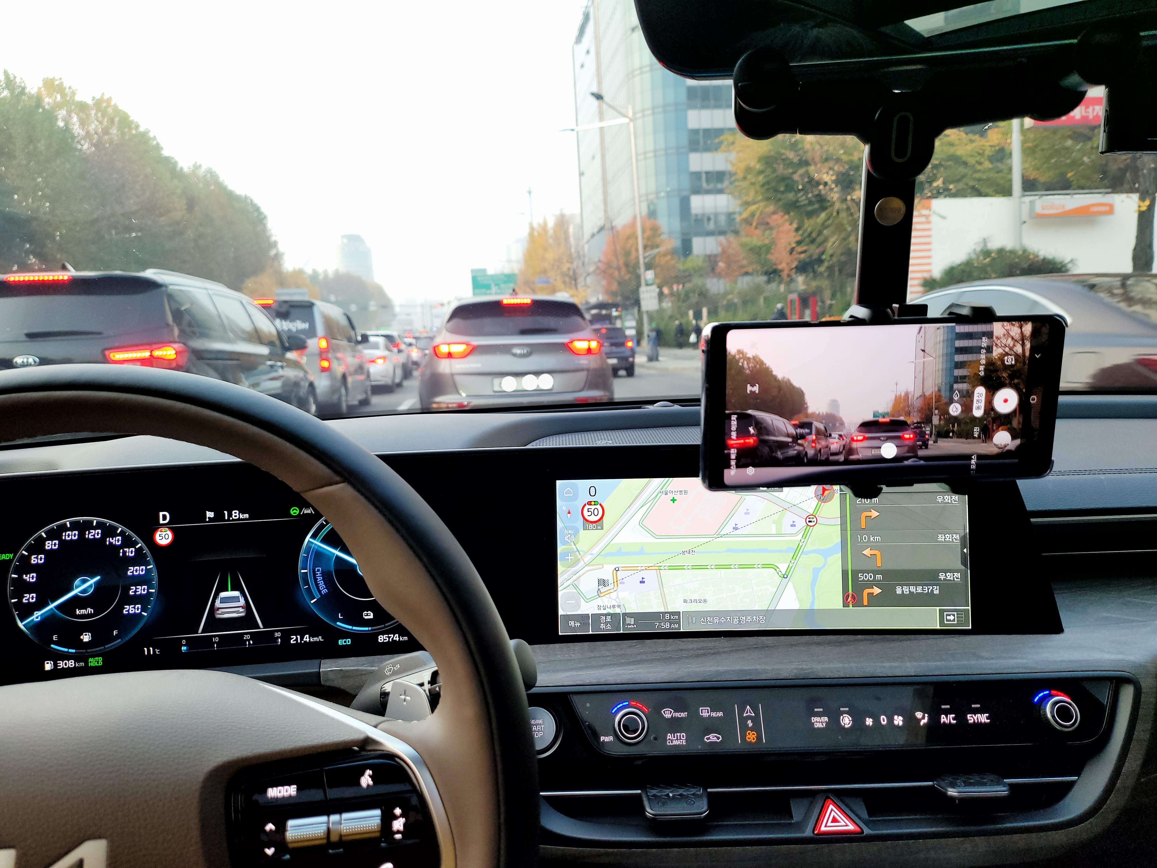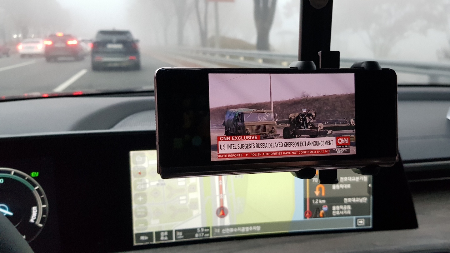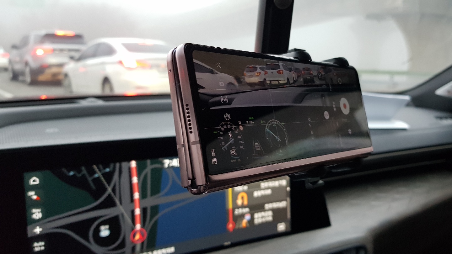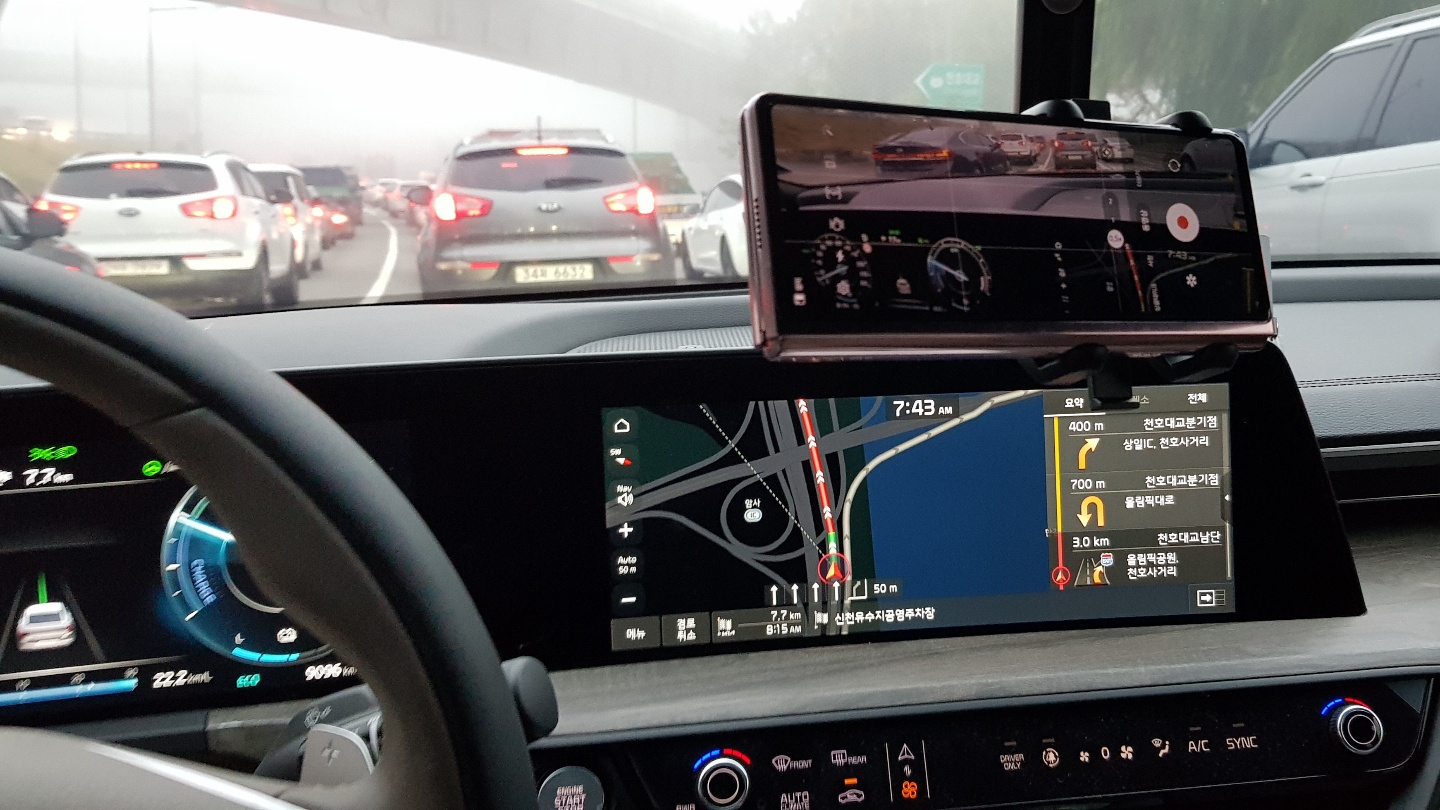 맨 위 사진처럼 갤럭시노트8을 거치했었는데요. 정말 아쉽게도 노트8 카메라는 광각 지원이 안됩니다. 광각이란 쉽게 말씀드려 일반 렌즈를 통해 보는 화면이 100의 크기만큼 풍경을 담는다면, 광각은 200의 크기만큼 더 많은 풍경을 담을 수 있습니다. 아래 영상은 갤럭시폴드2를 거치대에 설치하고 광각(0.5배율)으로 K8하이브리드 주차 / 어라운드뷰 영상을 찍었는데요. 광각이기 때문에 더 넓은 장면을 카메라에 담을 수 있어 어라운드뷰가 적용되는 네비게이션과 앞 유리를 통한 외부 모습을 함께 담을 수 있습니다.