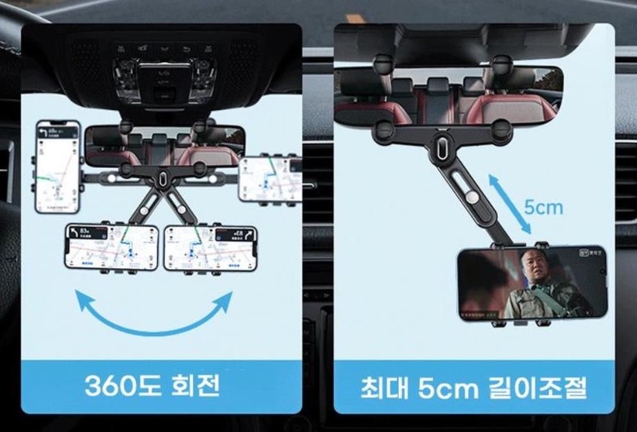 룸미러 거치대에 스마트폰을 걸어 놓으면 카메라 렌즈를 전방으로 했을 때는 제 2의 블랙박스가 되고, 셀카모드일 땐 셀카 찍기에 좋고, 네비게이션으로 하면 네비용으로 사용 가능합니다. 차량 전면부 대시보드쪽이 가려진다 싶으면 위 이미지처럼 룸미러 옆으로 돌려 놓으면 시야를 가리는 게 줄어들겠죠. 아래 이미지처럼 자유자제로 방향 이동이 가능합니다.