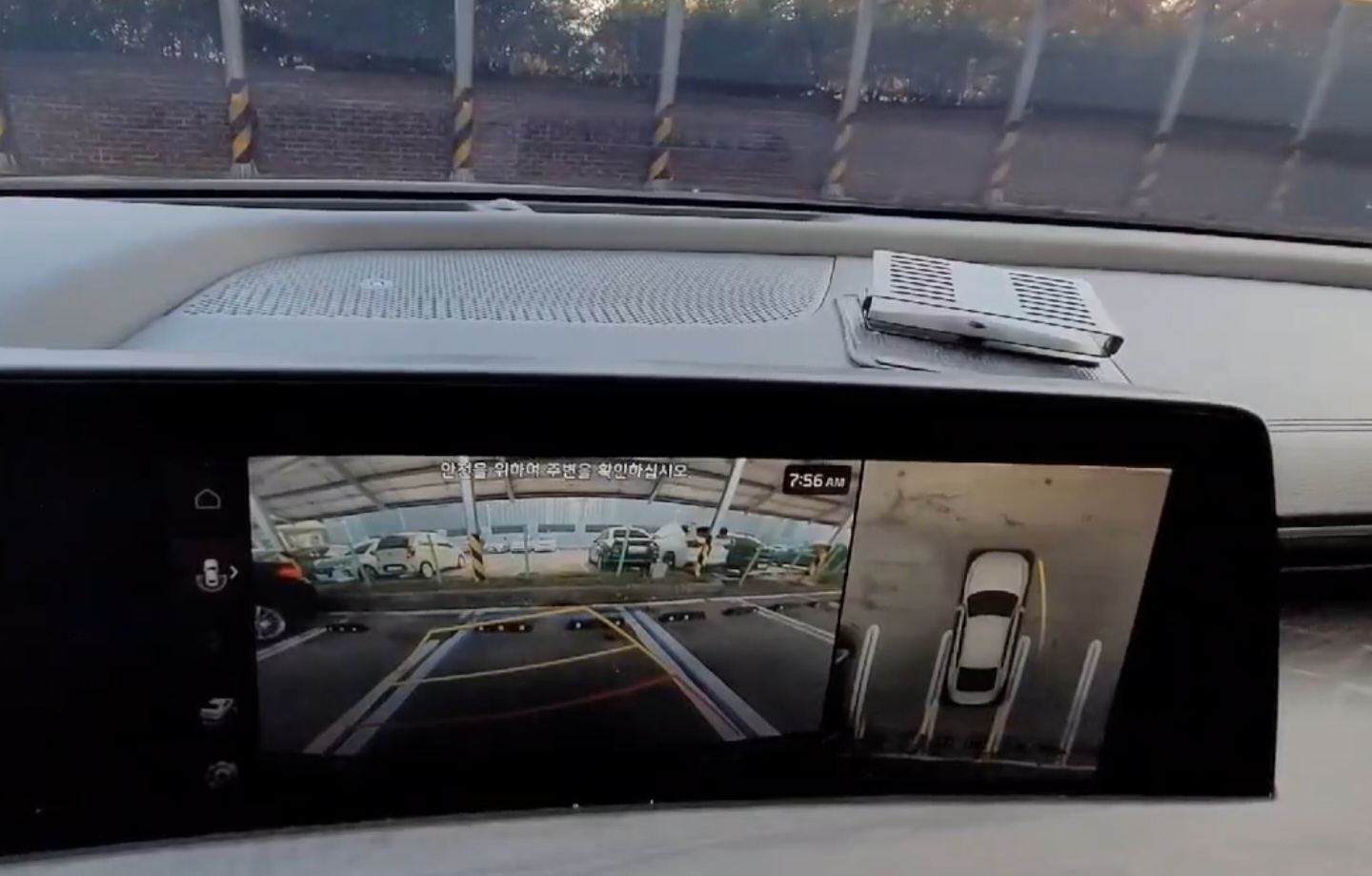 맨 위 사진처럼 갤럭시노트8을 거치했었는데요. 정말 아쉽게도 노트8 카메라는 광각 지원이 안됩니다. 광각이란 쉽게 말씀드려 일반 렌즈를 통해 보는 화면이 100의 크기만큼 풍경을 담는다면, 광각은 200의 크기만큼 더 많은 풍경을 담을 수 있습니다. 아래 영상은 갤럭시폴드2를 거치대에 설치하고 광각(0.5배율)으로 K8하이브리드 주차 / 어라운드뷰 영상을 찍었는데요. 광각이기 때문에 더 넓은 장면을 카메라에 담을 수 있어 어라운드뷰가 적용되는 네비게이션과 앞 유리를 통한 외부 모습을 함께 담을 수 있습니다.