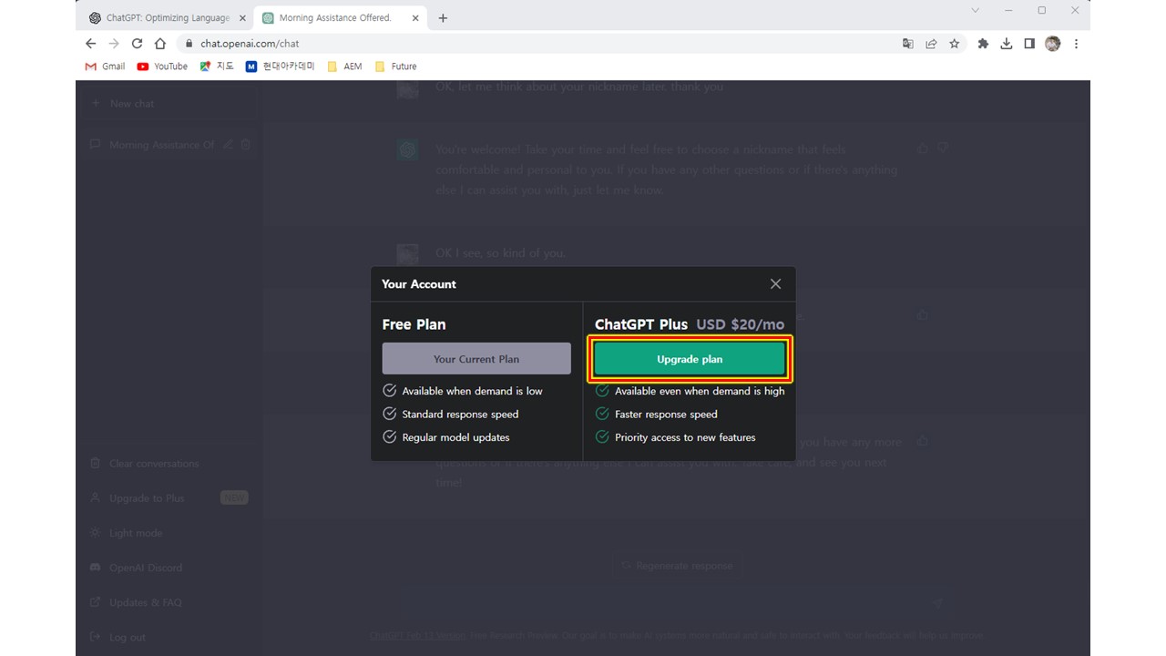 무료 버전인 저와 유료 버전인 이 직원의 챗지피티에게 동일한 질문을 남겼을 때,