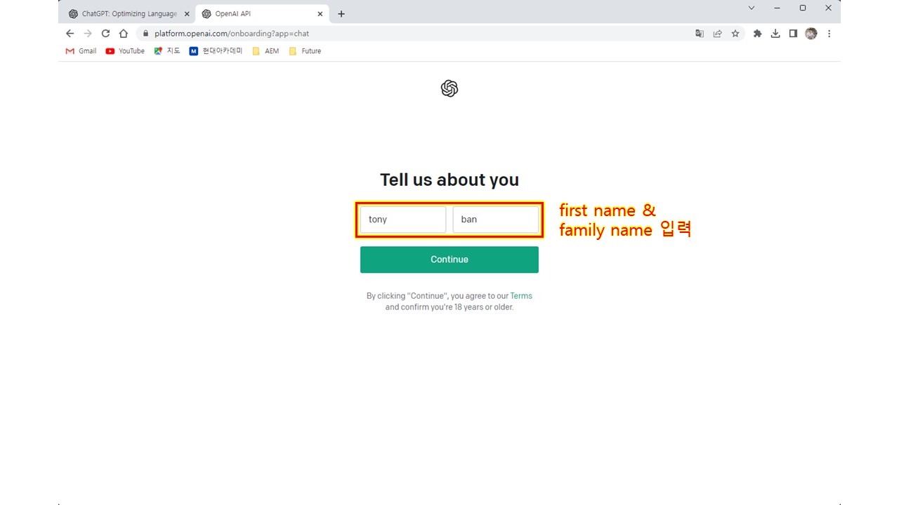왼쪽 박스에 이름을, 오른쪽 박스에 성을 기입합니다.