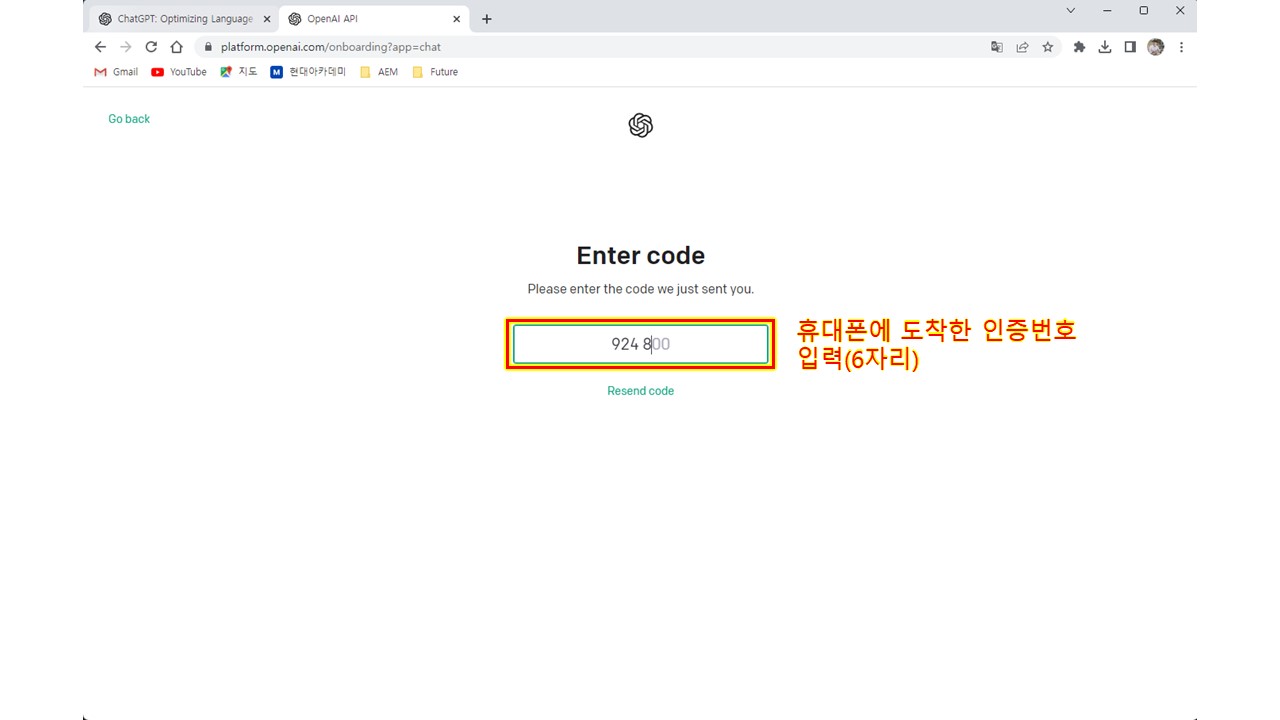 핸드폰 번호를 입력하고 'Send code'를 클릭하여 인증 코드를 요청합니다.