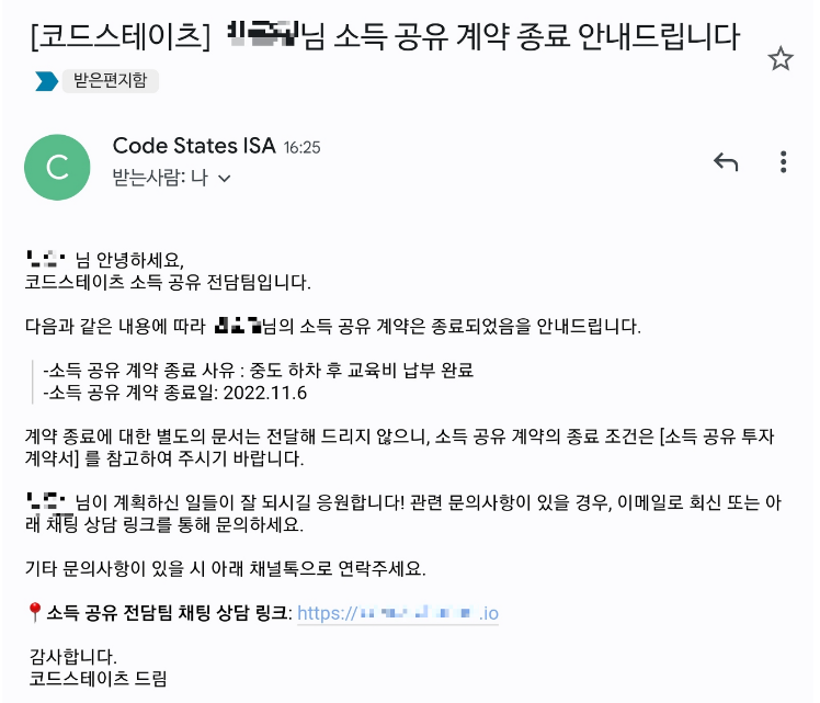 부트캠프를 다니는 이유도 개발자가 되기 위함인데, 정규과정인 22주(약 5개월 반)를 마친다고 해도 개발자로 취업한다는 보장이 없기 때문에 조건도 괜찮은 지금 회사로 취업하게 되었습니다. 부트캠프 마지막 달인 2월의 다음달, 즉 3월부터 어제인 11월까지 9개월간 교육비를 납부했는데요. 첨부해 드리는 이메일은 모든 교육비 납부를 마쳤다는 증빙을 받았다는 내용입니다.