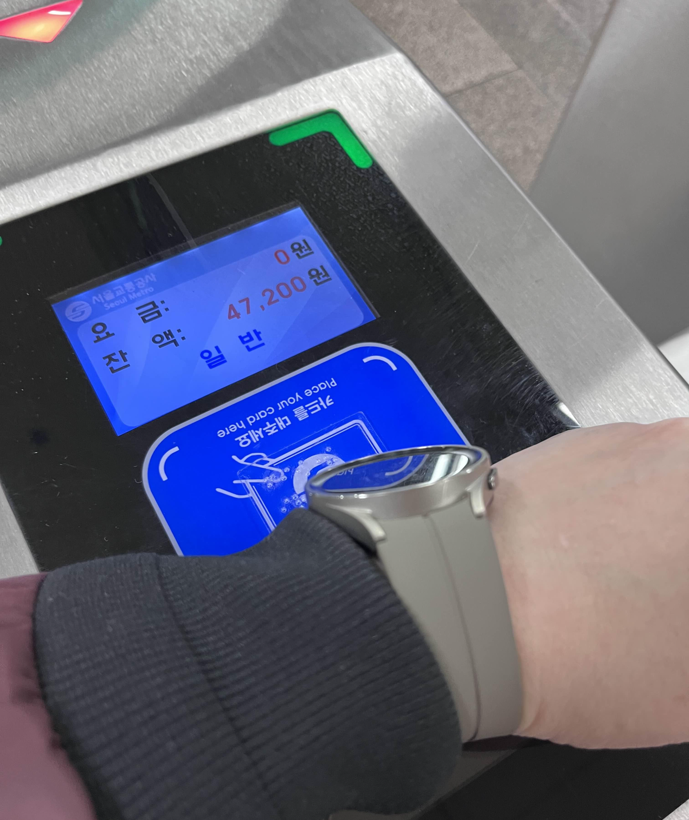 지하철 개찰구를 통과할 때 아래 사진처럼 센서에 스마트워치를 비스듬히 대거나, 살짝 거리가 있어도 태그가 잘 됩니다.