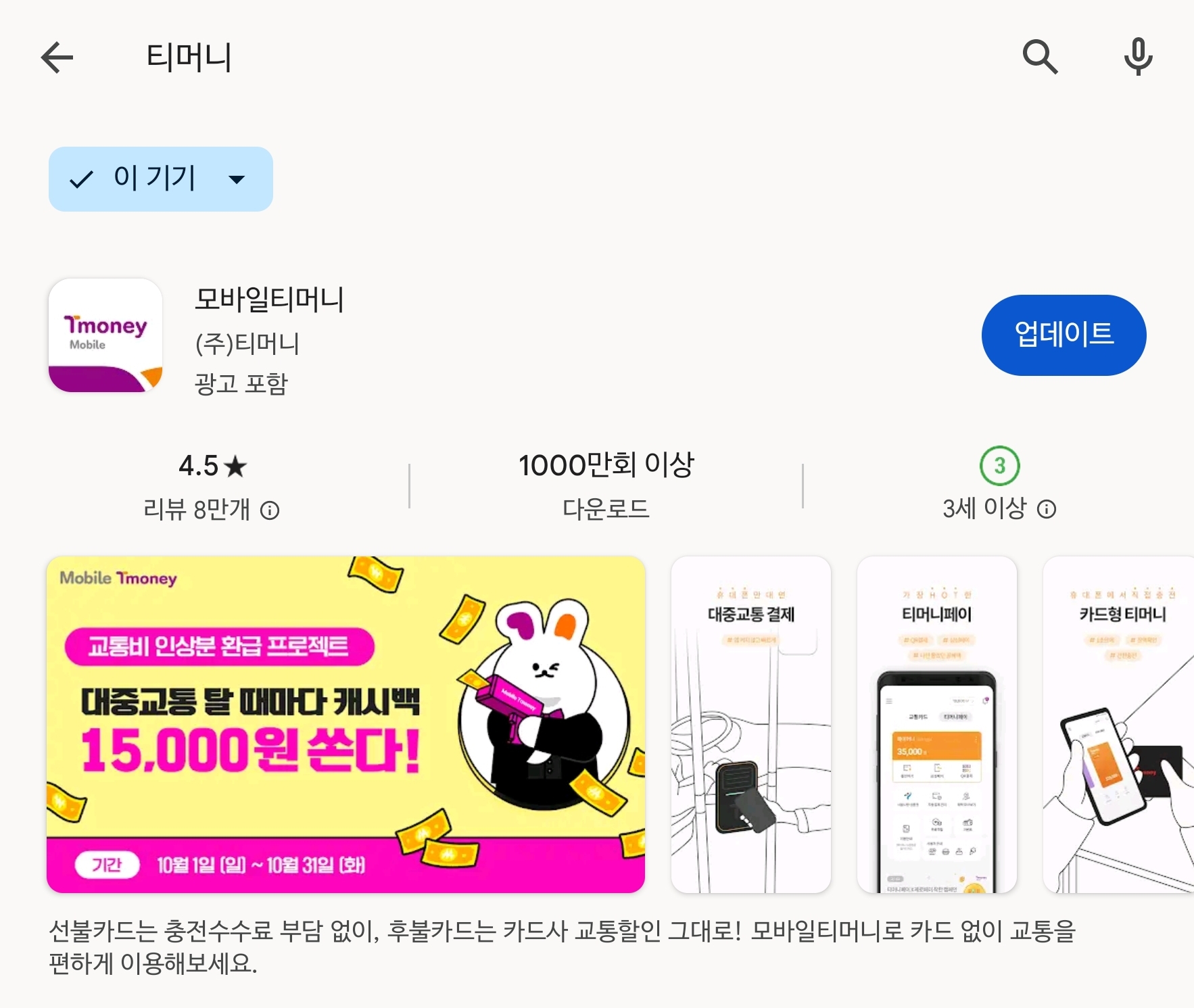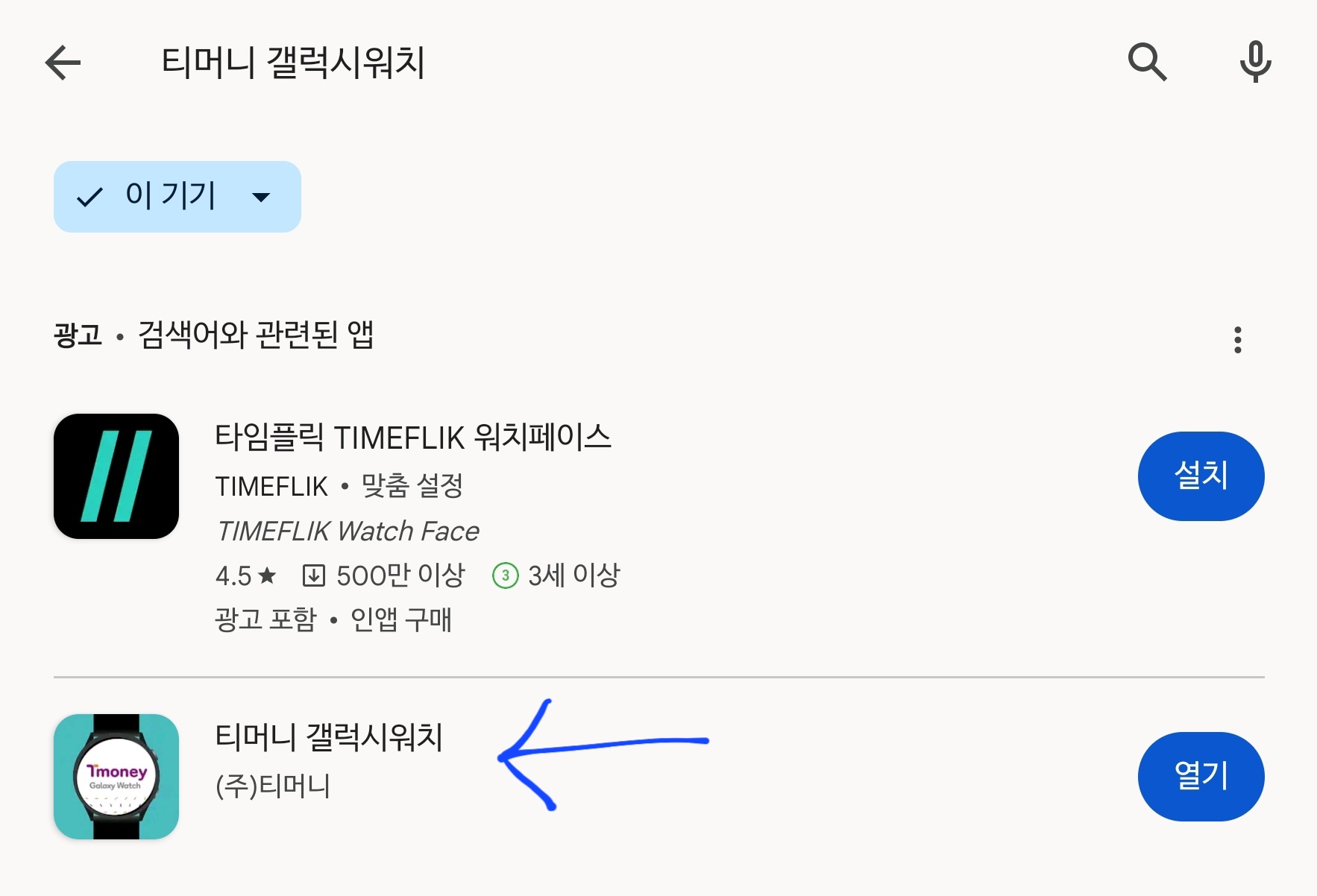 스마트폰으로 티머니를 결제하실 분들은 아래의 "티머니"앱을 깔면 되고, 스마트워치에서 결제하실 분들은 "티머니 갤럭시워치"앱을 깔아야 한다는 점, 잊지 마세요!