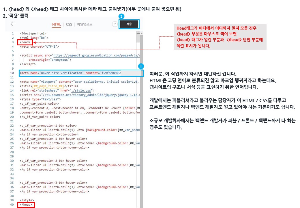 1. <head> 와 </head> 태그 사이에 복사한 메타 태그 붙여넣기(아무 곳에나 붙여 넣으면 됨)
