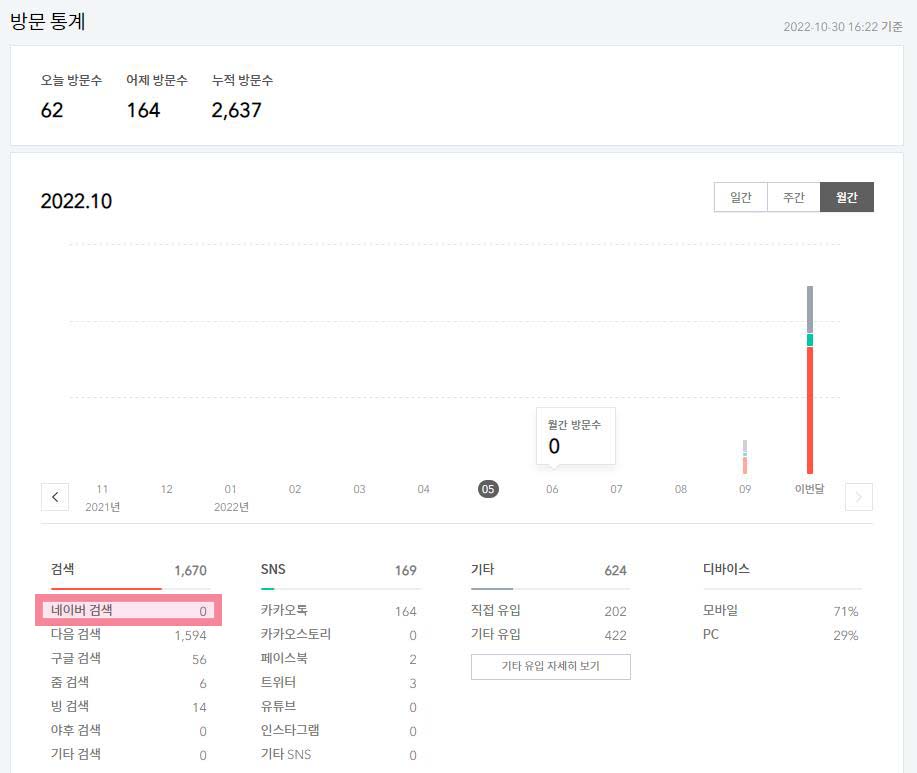 고맙게도 다음(daum)에서 많이 도와줘서 다음 검색량은 꾸준히 올라오는 것 같은데요. 네이버나 구글 같은 기타 메이저 채널로부터의 유입도 있어야 블로그가 더 발전하지 않을까 생각합니다. 구글은 적지만 그래도 '0건'은 아닌데, 네이버는 왜....