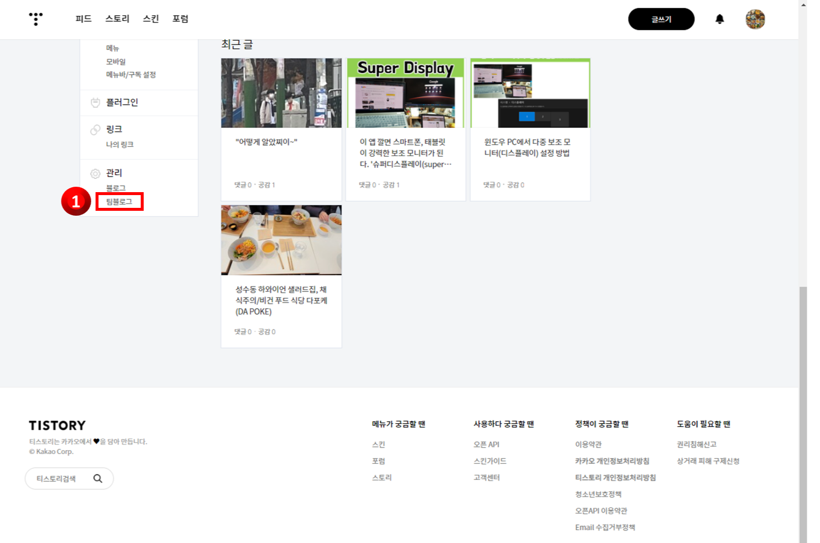 1. 티스토리 접속 후 '팀블로그' 클릭
