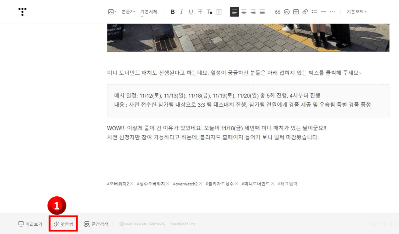 1. 글을 작성하고 하면, 화면 하단에 있는 '맞춤법' 메뉴를 클릭합니다.