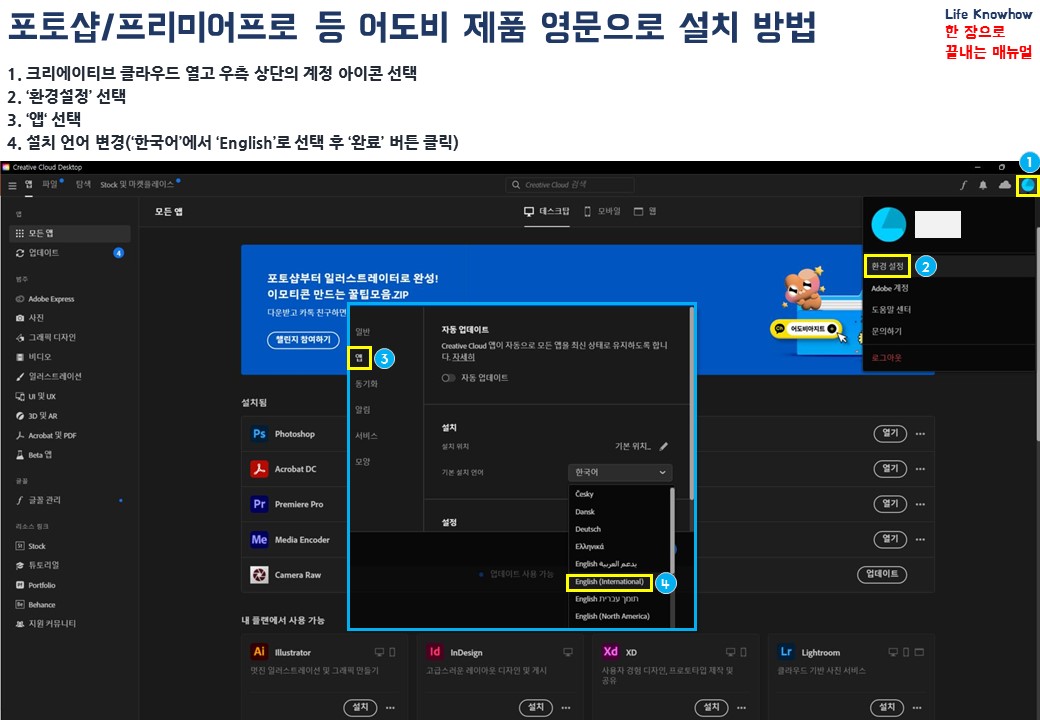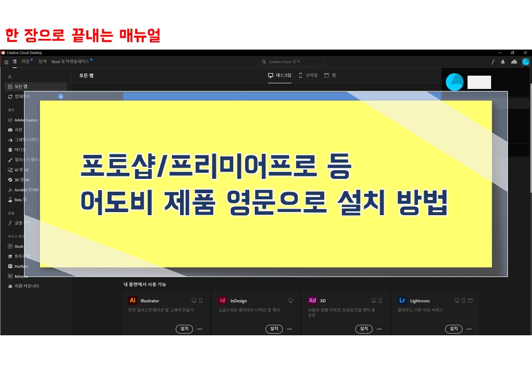 특히 저처럼 Adobe Experience Manager 같은 어도비 제품을 전문적으로 사용하는 사람들에겐 영문 튜토리얼이 필수인데요. 이러한 영문 튜토리얼을 보는 분들에겐 제품 역시 영문으로 깔려 있어야 합니다.